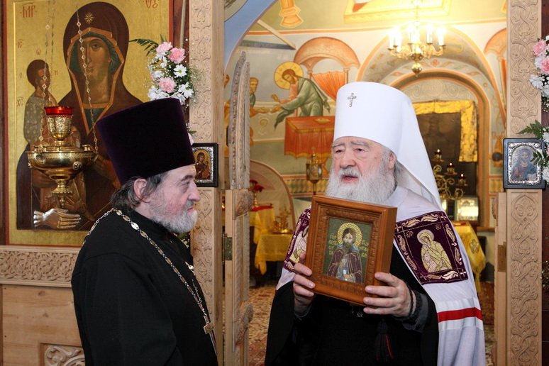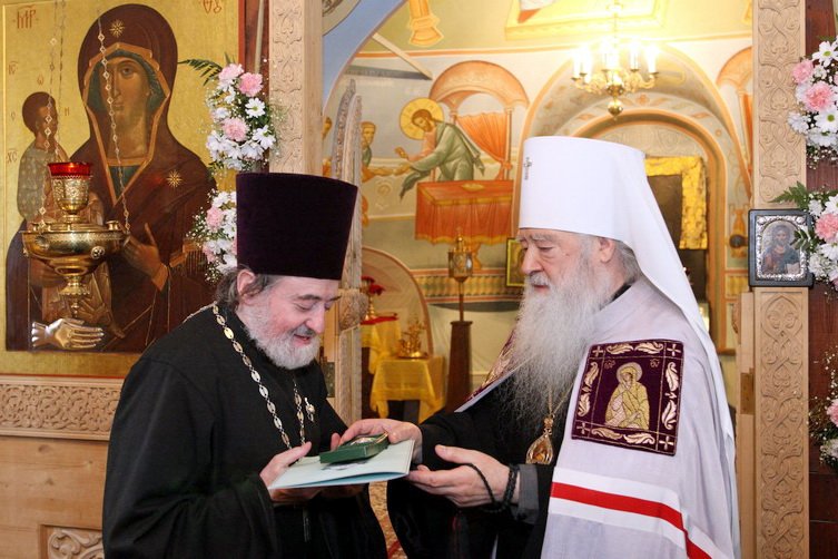 Очень важно, что отец Владимир, который начинал здесь свои пастырские труды, потянулся душой к нам и принес нам святыни, мощи святых угодников Божиих. Я благодарю вас, дорогой отец Владимир и духовенство, которое прибыло сегодня в качестве гостей для нашей совместной молитвы. Я думаю, братья и сестры, это сегодня праздник всей нашей епархии, не только этого прихода. Я поздравляю вас с этим замечательным днем. На молитвенную память хотел бы передать вам образ иконы Божией Матери „Знамение“ и пусть Царица Небесная хранит вас всех, предстательствуя о вас перед Спасителем нашим и Господом Иисусом Христом. Невозможно, конечно, всех поименно сегодня поблагодарить и выразить признательность в виде наград, но мне хочется в первую очередь поблагодарить отца Сергия за его подвиг, преподнести ему образ его небесного покровителя прп. Сергия Радонежского. Пусть преподобный Сергий помогает вам в дальнейших ваших трудах на благо святой Церкви. Святейший Патриарх Московский и всея Руси Кирилл, отмечая ваш подвиг, удостоил вас награждения орденом преподобного и богоносного отца нашего Серафима Саровского. Исполняя послушание Святейшего, с радостью передаю вам эту патриаршую награду».