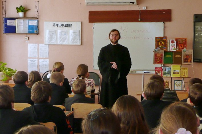 14 марта в средней школе № 4 г. Павловский Посад состоялся открытый урок, посвященный Дню православной книги. Диакон Михаил Дерябин, клирик храма Рождества Богородицы деревни Саурово, встретился с учащимися школы, рассказал о появлении книгопечатания на Руси и о значении книги в жизни современного человека, сопроводив свой рассказ показом видео-презентации «Первая печатная книга на Руси». Из нее ученики узнали об авторах первой печатной книги в России, увидели ее образец, первый книгопечатный станок и многое другое. Также был подготовлен стенд с духовной литературой, некоторые образцы были подарены учащимся для их школьной библиотеки. Ребята задавали вопросы и проявили большой интерес к этому мероприятию, выразив надежду, что подобного рода праздники станут регулярными и сами ученики обязательно подготовят свои выступления.
