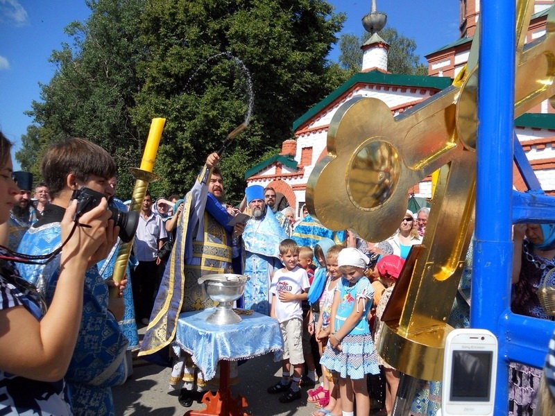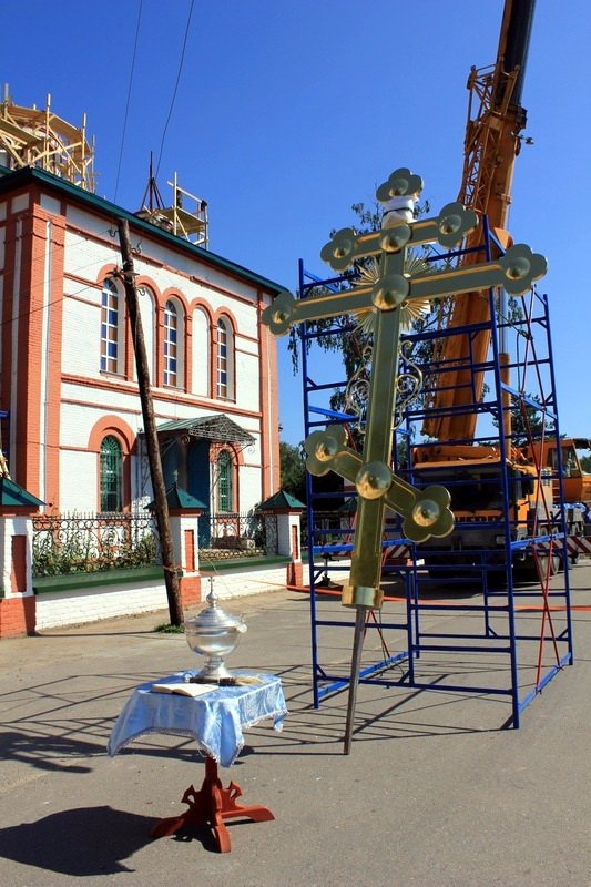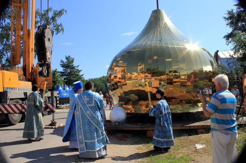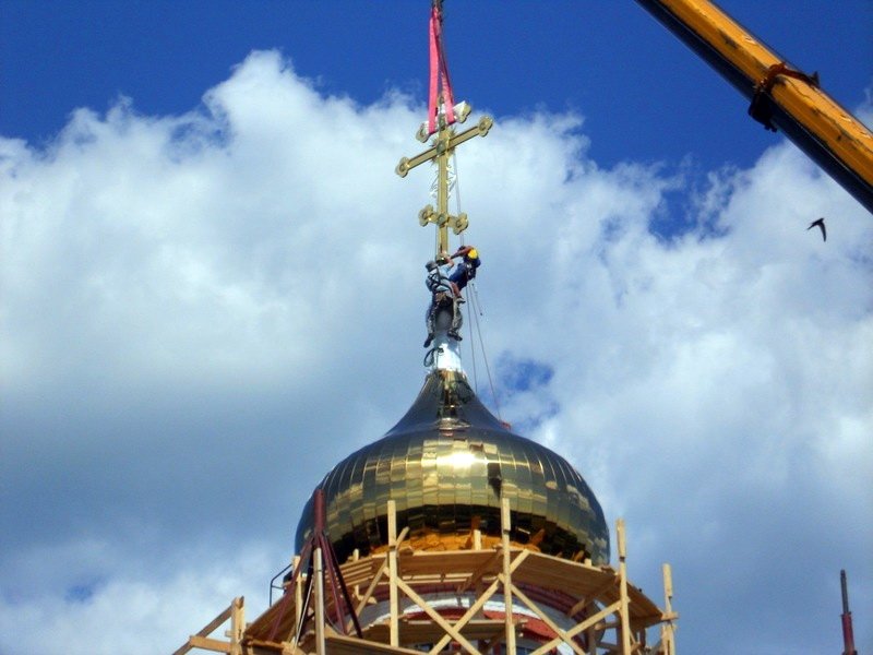 По завершении Литургии священнослужители вместе с прихожанами и хором совершили чин освящения нового креста и куполов. После молебна все богомольцы приложились к освященному кресту, и бригада монтажников при помощи автокрана благополучно установила крест и купола на кровле церкви.