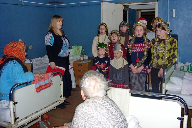 10 января члены группы вместе с настоятелем Успенского храма села Богослово протоиереем Владимиром Владимировым и клириком Богоявленского собора диаконом Владимиром Градовым обошли все отделения Центральной районной больницы г. Ногинска. Были отслужены праздничные молебны, после чего священник под праздничные песнопения окропил святой водой всех пациентов и медицинский персонал. Всем больным и медикам были вручены небольшие подарки. А 11 января волонтеры «Милосердия» поздравили и вручили сладкие подарки пациентам соматического отделения и психиатрического диспансера.