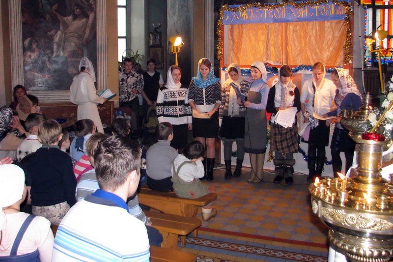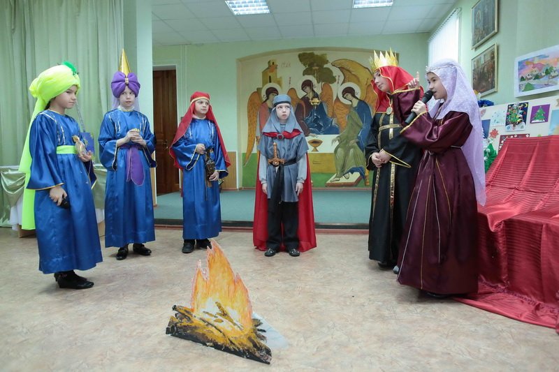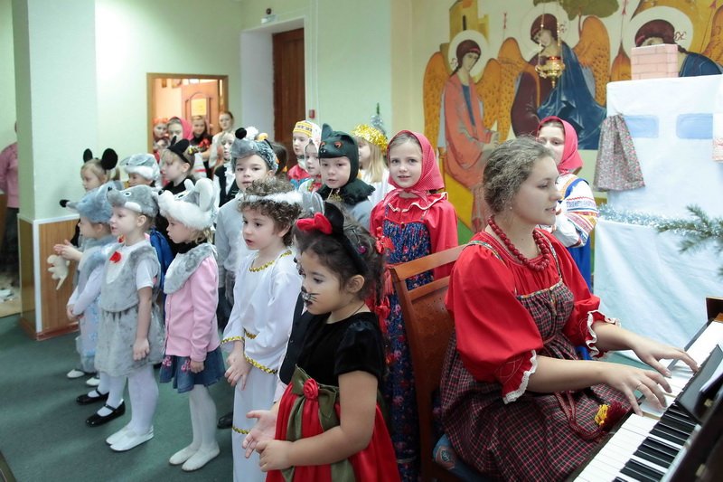 8 января в Троицком соборе г. Щелково после Литургии учащиеся воскресной школы, фольклорный ансамбль «Жалейка», кружок для девочек «Юница» и школа алтарников собора подготовили праздничное поздравление, в котором приняли участие дети разных возрастных групп и коллективы прихода. Для фольклорного ансамбля «Жалейка» швейная мастерская Троицкого собора подготовила к рождественскому выступлению ребят народные костюмы. Не просто сарафаны и рубахи, а старинные мезенские костюмы, большинство деталей которых шили вручную, как и принято было в старину. Воскресная школа разучивала песни и слова рождественской постановки, а батюшки готовили для детей подарки. Дети показали