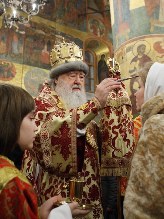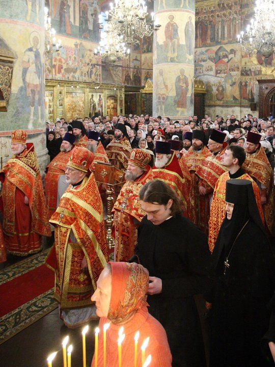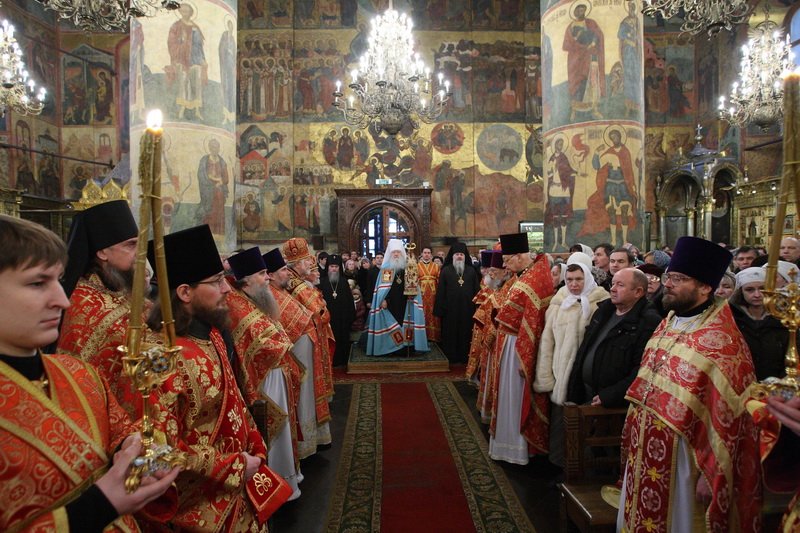 Мне хочется еще сказать, что Церковь готовит нас к Великому посту, сегодня начинается первая подготовительная неделя, и мы слышали за Божественной литургией притчу о мытаре и фарисее. Эта притча знакома многим из нас с детства, но как перед началом поста она вновь оживает, приобретая новое значение для каждого из нас. И мы видим среди находящихся в храме и тех, кто является постоянным богомольцем, и тех, которые или случайно в храм заходят, или редко бывают, но сегодня для всех нас это назидание. Не нужно осуждать других. Следует заглянуть вглубь своего сердца, не думать, что мы лучше всех, но подражать примеру кающегося мытаря, который не мог очей своих поднять ко Господу, а лишь бия себя в грудь, повторял: „Боже, милостив буди мне грешному“ (Лк. 18:13). Вот с этой молитвой каждый сегодня пусть начнет свою подготовку к Великому посту. Я хотел бы от души поблагодарить братьев архипастырей, священнослужителей нашей Московской епархии, и студентов Коломенской духовной семинарии, которые сегодня своим пением так украсили наше праздничное богослужение. Я всех вас поздравляю с праздником, причастников и причастниц с принятием Святых Христовых Таин, и на всех вас призываю Божие благословение».