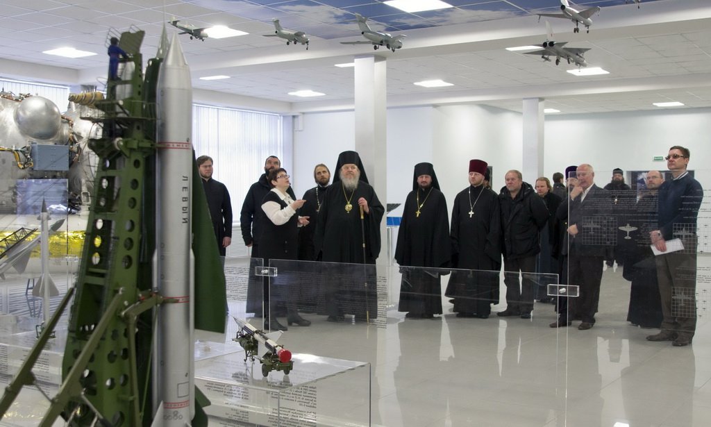 Затем Владыка Николай посетил музей, в котором представлены основные разработки завода, как советского времени, так и современного производства. На заводе были сконструированы первые в мире лунные модули и первый в мире луноход, совершившие посадки на Луне, марсоходы, посадочные модули на Венеру, а также многие прототипы современного ракетостроения и космической техники.