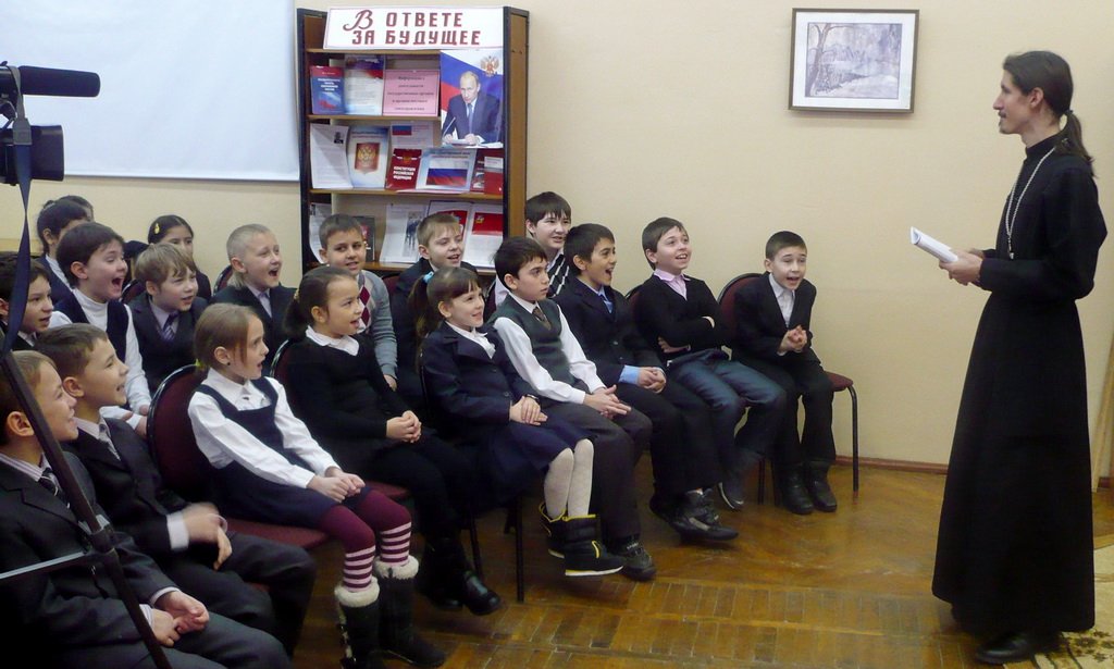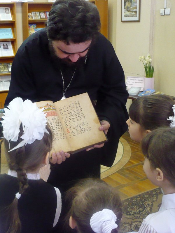 Затем в 12:30 состоялась встреча со школьниками 7-х классов. Ребята выслушали доклад заведующей библиотеки А. П. Зеленской, смогли прикоснуться к старинным книгам, посмотрели фильм-притчу «Немая молитва», после которой отец Виктор провел беседу с детьми. На память учащимся были подарены специально напечатанные буклеты.