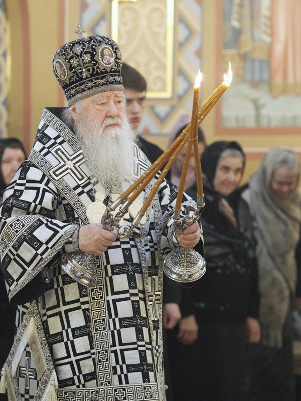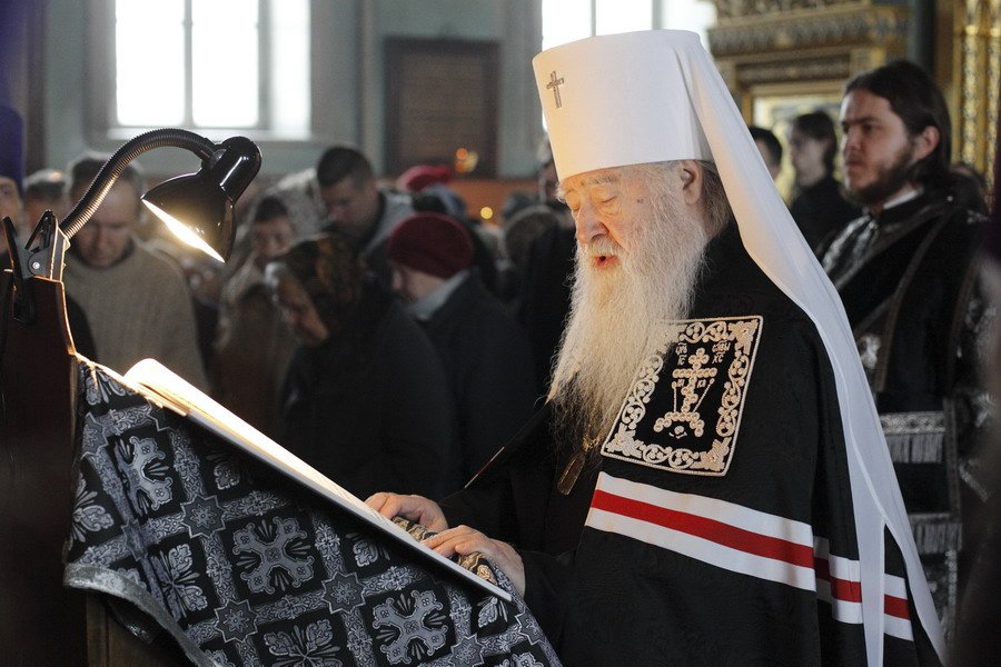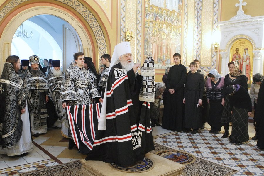 Вечером, в 17 часов, в Тихвинском храме на Соборной площади митрополит Ювеналий совершил положенное в этот день по уставу великое повечерие, за которым читал Великий покаянный канон преподобного Андрея Критского.
