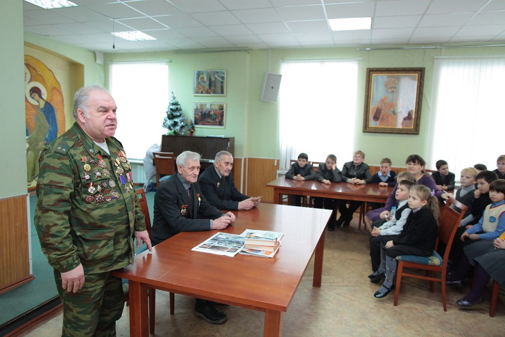 10 февраля в конференц-зале Щёлковского благочиния состоялась встреча учащихся православной гимназии «Ковчег» с ветеранами Вооруженных сил и участниками Великой Отечественной войны. Встреча была посвящена юбилейным датам нынешнего года: 70-летию освобождения Ленинграда от блокады и 25-летию вывода войск из Афганистана. Ветеран Вооруженных сил и труда, член областного совета ветеранов В. М. Мещеряков представил приглашенных гостей: участника битвы в Заполярье, ветерана Великой Отечественной войны К. А. Мазуркевича и участника Афганской войны С. В. Терехова.