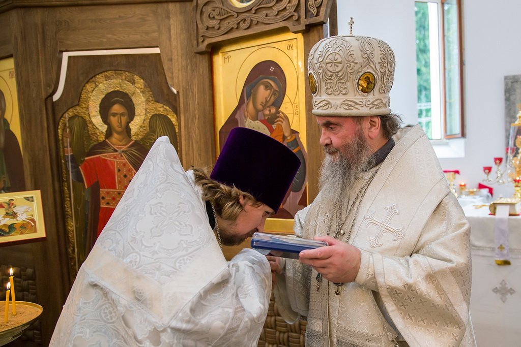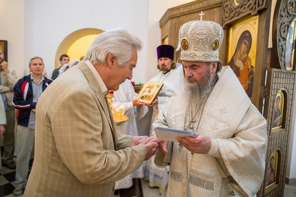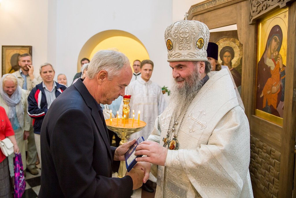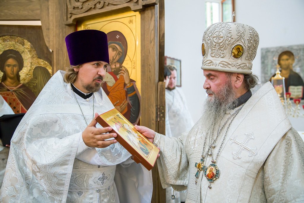 Протоиерей Андрей Ковальчук и священник Игорь Логунов сердечно поблагодарили архиепископа Григория за совместную молитву и поздравления и преподнесли Владыке от духовенства и прихожан храма икону великомученика Георгия Победоносца.