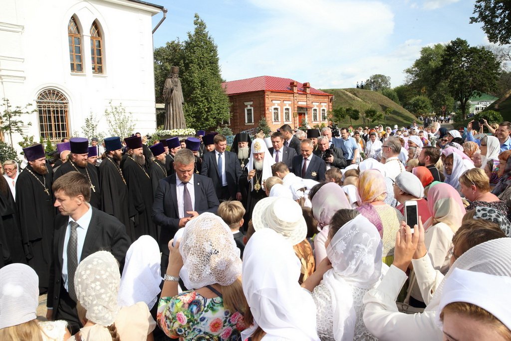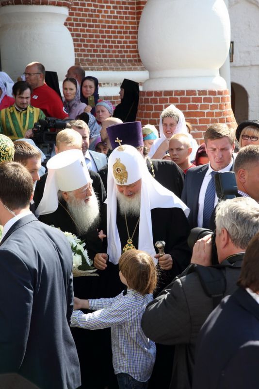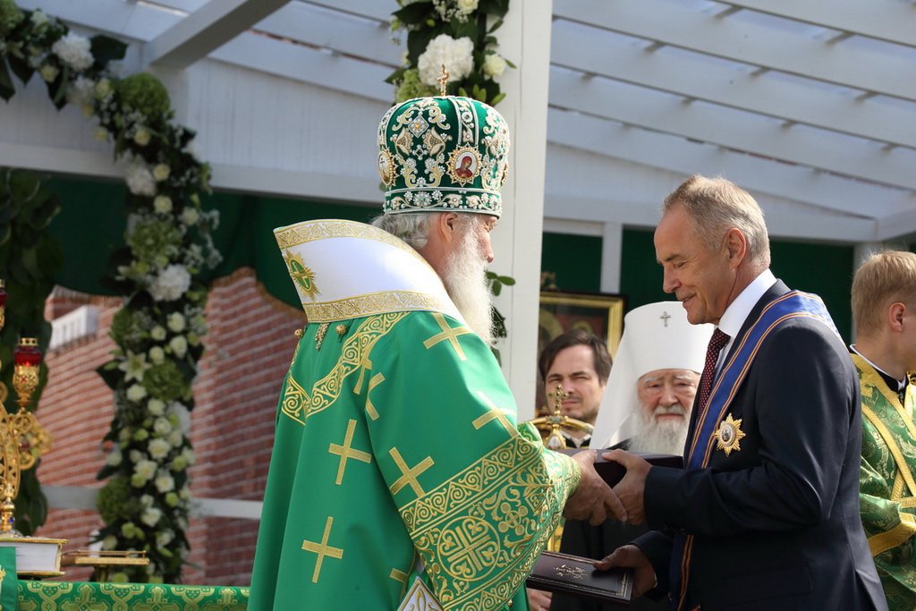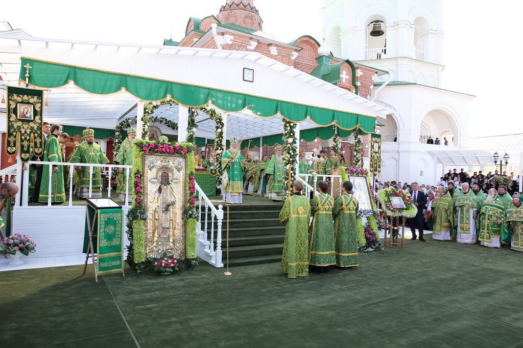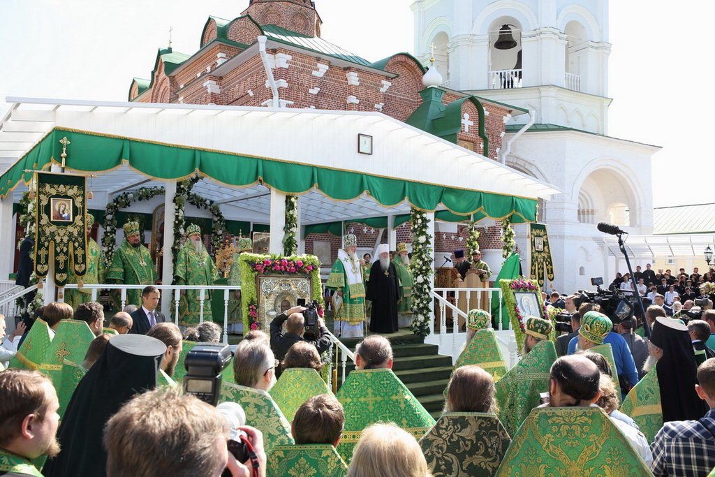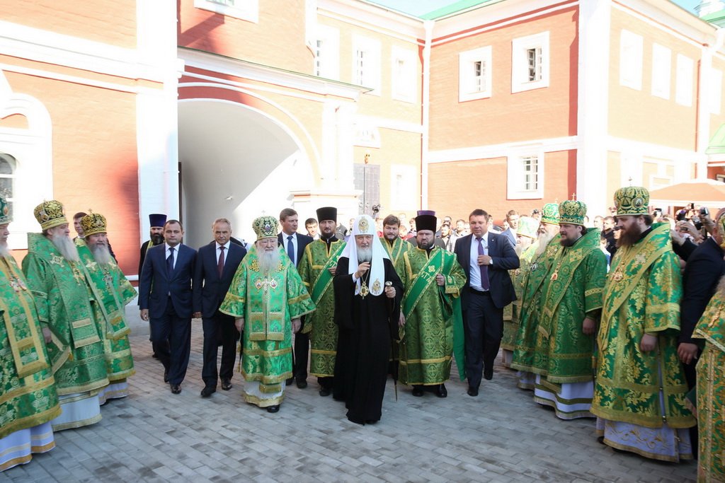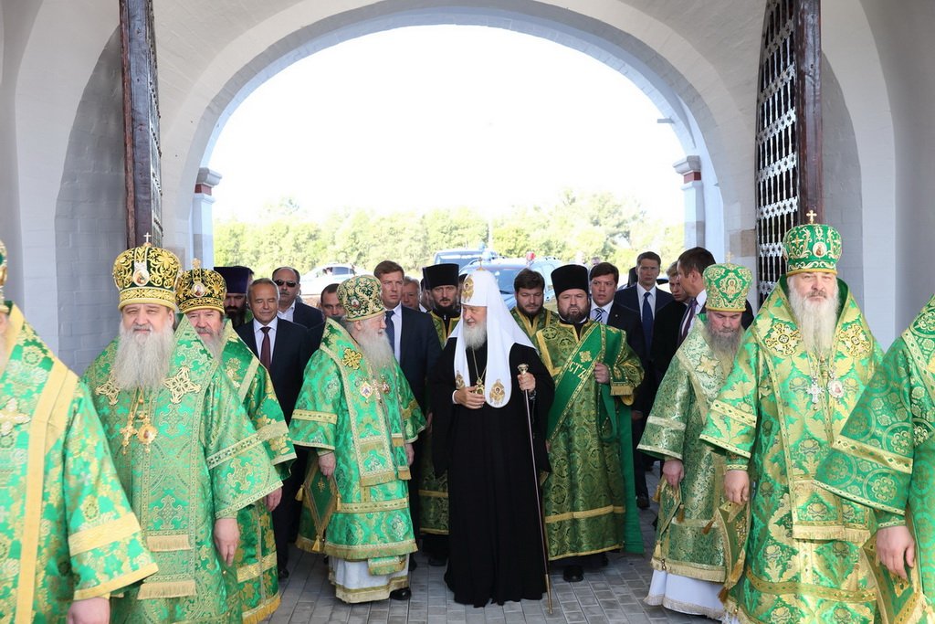 У святых врат монастыря Святейшего Патриарха встречали митрополит Крутицкий и Коломенский Ювеналий, председатель Московской областной думы
