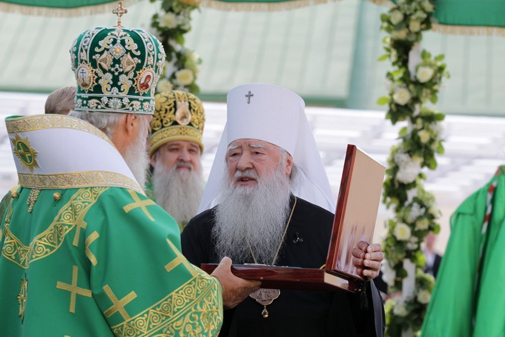 По окончании Литургии Святейшего Владыку приветствовал митрополит Ювеналий: