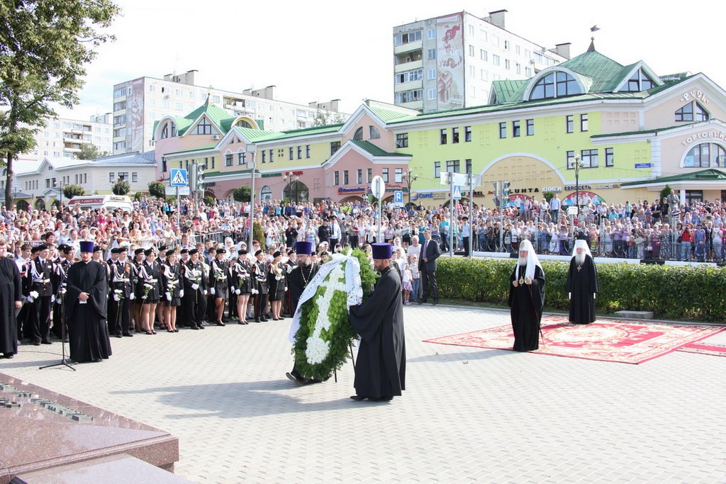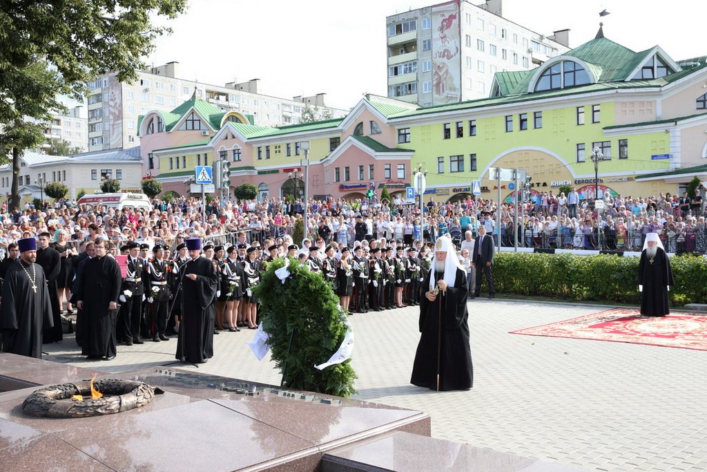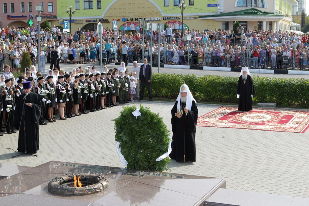Прибыв на центральную площадь Дмитрова, Предстоятель Русской Церкви возложил венок к памятнику