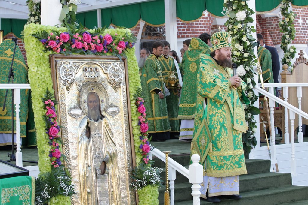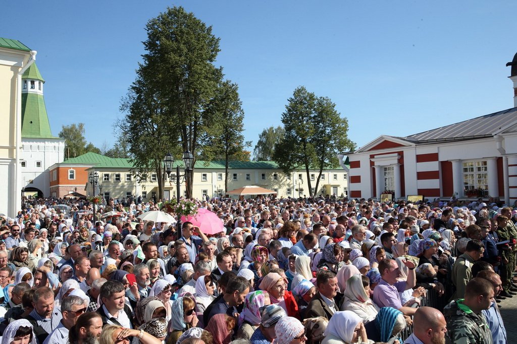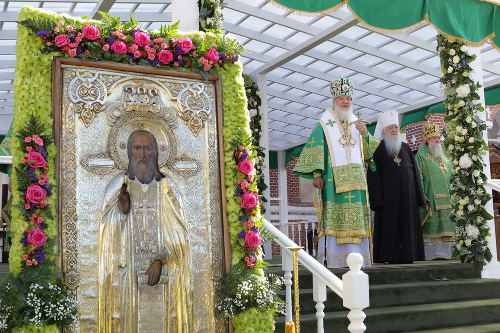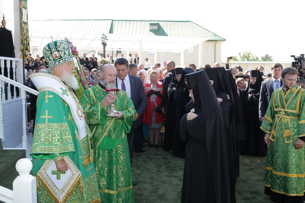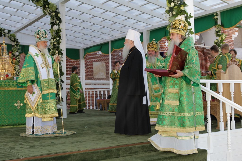 Спасибо Вам за то, что Вы предприняли Первосвятительский труд паломничества сюда, возглавления этого богослужения. Спасибо за благословение всем нам прибыть сюда, и множеству верующих, которые с радостью сегодня присутствовали за этим богослужением. Для нас останется в памяти и в истории Ваш сегодняшний Первосвятительский визит. И мы просим от нас, монашествующих, принять, Ваше Святейшество, эти святые панагии и крест с тем, чтобы Вы, когда будете совершать свое патриаршее богослужение, поминали нас недостойных в своих святых молитвах. Пусть Господь предстательством наших святых, в земле Российской просиявших, хранит Вас на многая и благословенная лета!»