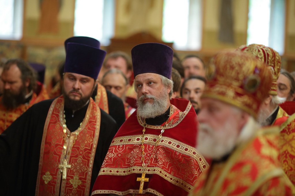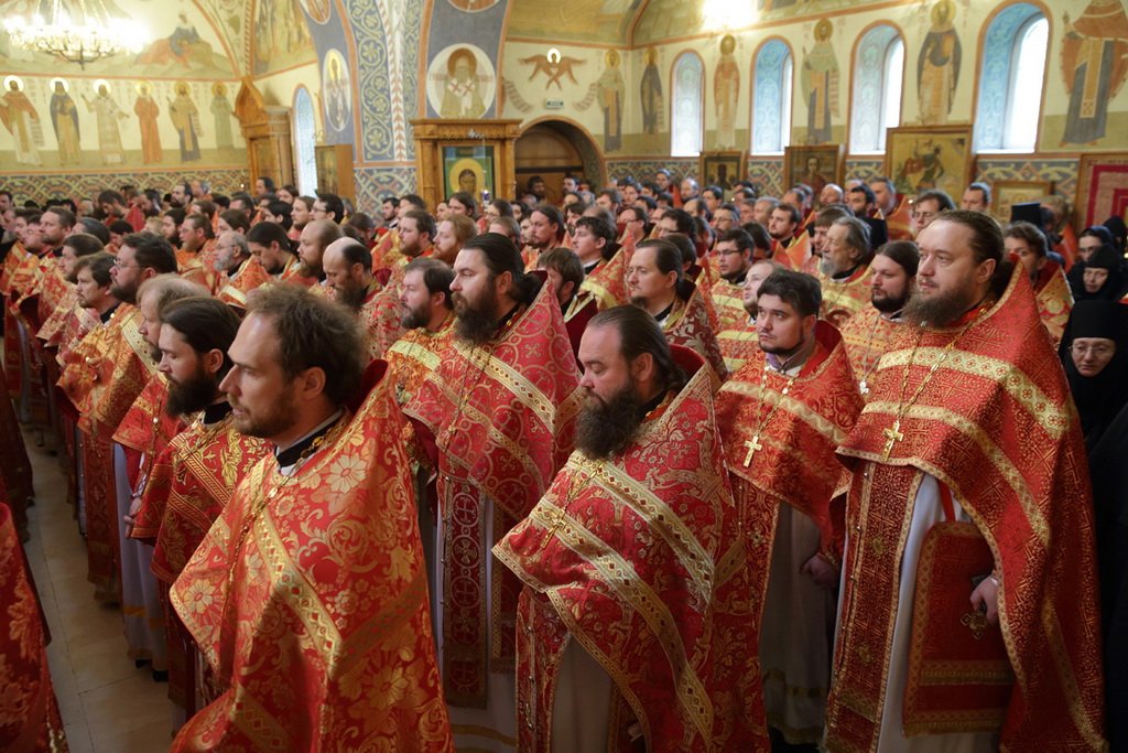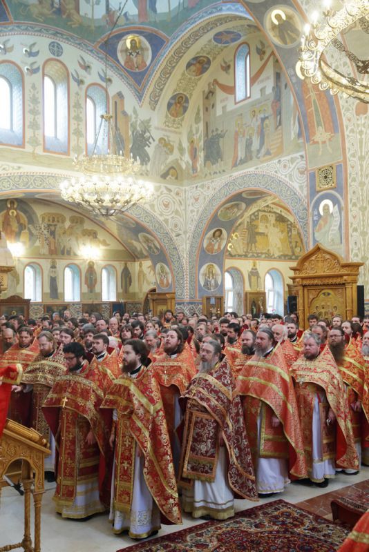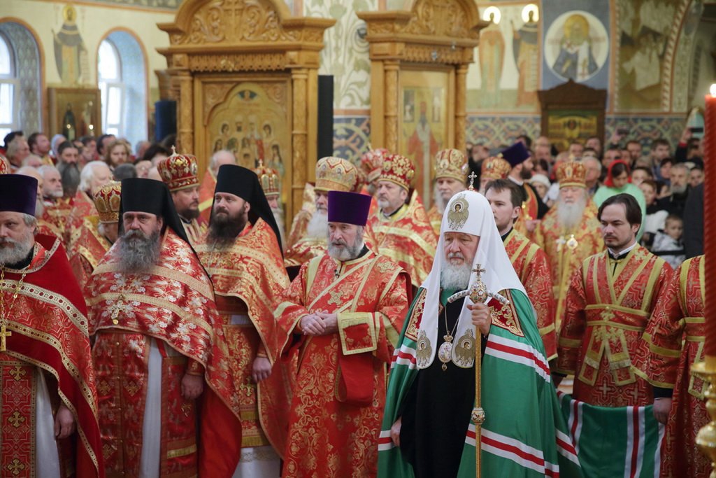 Его Святейшеству сослужили: митрополит Крутицкий и Коломенский Ювеналий, Патриарший наместник Московской епархии; митрополит Истринский Арсений, первый викарий Патриарха Московского и всея Руси по г. Москве; архиепископ Верейский Евгений, председатель Учебного комитета Русской Православной Церкви; архиепископ Сергиево-Посадский Феогност, председатель Синодального отдела по монастырям и монашеству, наместник Троице-Сергиевой лавры; архиепископ Егорьевский Марк, председатель Финансово-хозяйственного управления Московского Патриархата; епископ Илиан (Востряков); епископ Гурий (Шалимов); епископ Видновский Тихон; епископ Дмитровский Феофилакт, наместник Андреевского ставропигиального монастыря; епископ Серпуховской Роман, благочинный монастырей Московской епархии; епископ Солнечногорский Сергий, руководитель Административного секретариата Московской Патриархии; епископ Подольский Тихон; епископ Орехово-Зуевский Пантелеимон, председатель Синодального отдела по церковной благотворительности и социальному служению; епископ Воскресенский Савва, первый заместитель управляющего делами Московской Патриархии; епископ Балашихинский Николай; епископ Зарайский Константин, ректор Коломенской православной духовной семинарии; протоиерей Владимир Диваков, секретарь Патриарха Московского и всея Руси по г. Москве; протоиерей Михаил Рязанцев, ключарь кафедрального соборного Храма Христа Спасителя; игумен Парамон (Голубка), наместник Донского ставропигиального монастыря; протоиерей Александр Агейкин, настоятель Богоявленского кафедрального собора; протоиерей Кирилл Каледа, настоятель храма Новомучеников и исповедников Российских на Бутовском полигоне; протоиерей Алексий Михаленя, временно исполняющий обязанности секретаря Московского епархиального управления; духовенство Москвы и Московской области.
