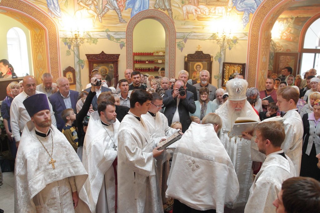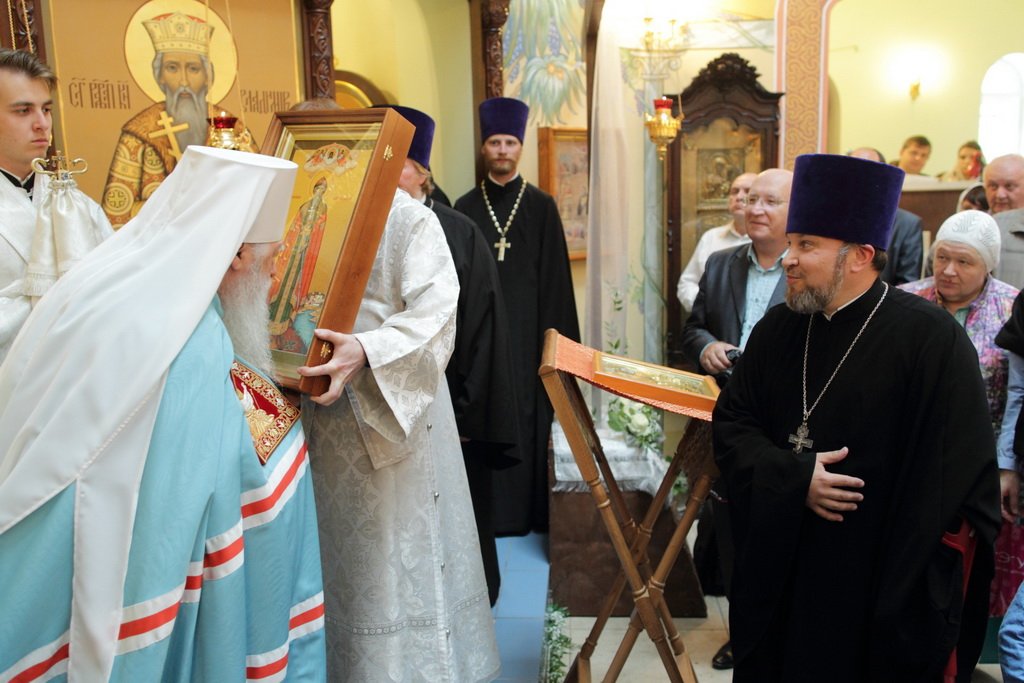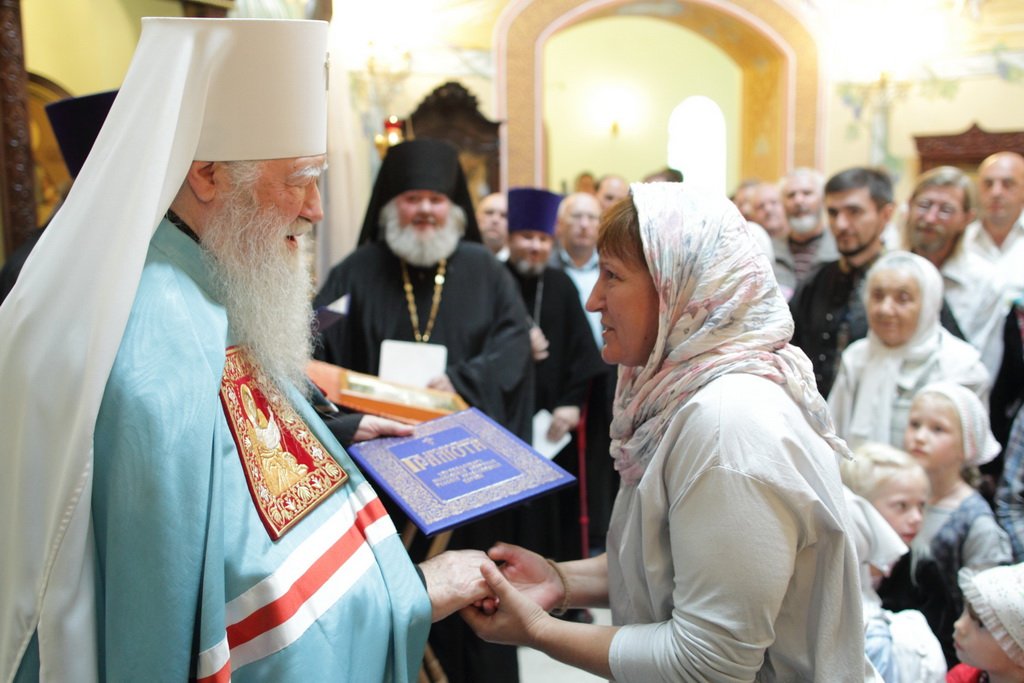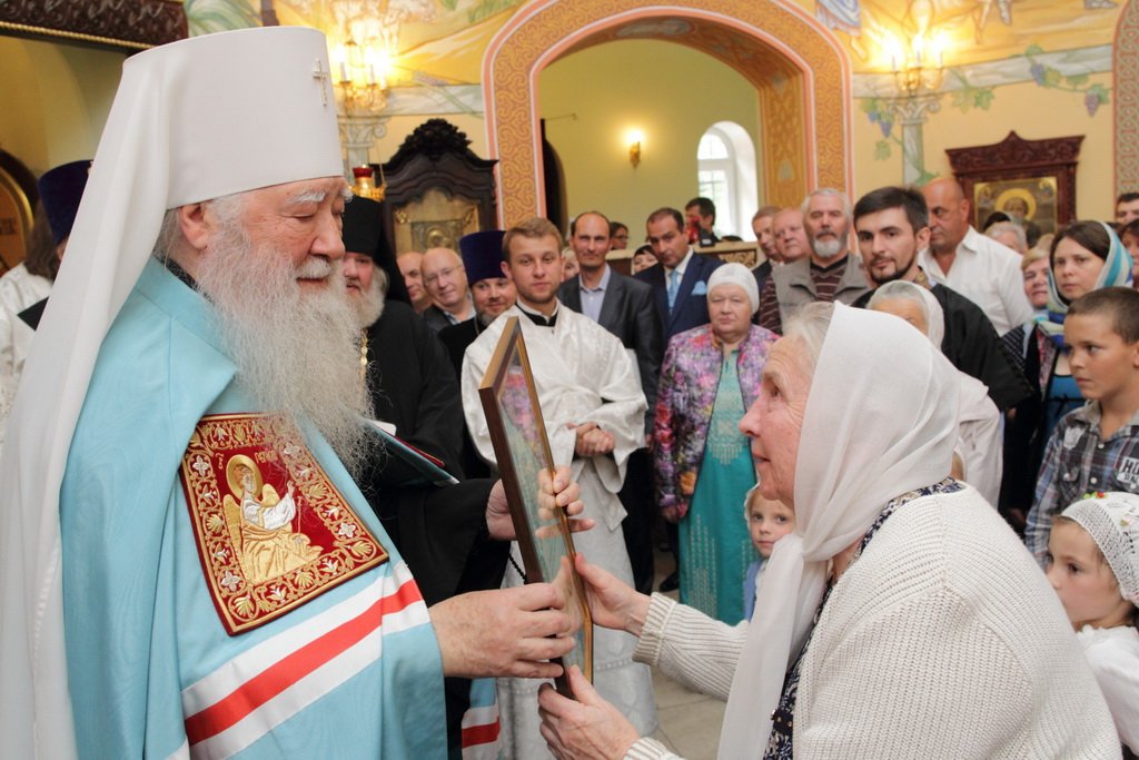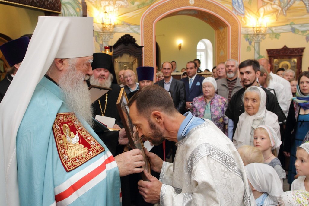 Я хотел бы горячо и сердечно поблагодарить и духовенство во главе с отцом благочинным, и власти, и всех вас, дорогие братья и сестры, которые присутствуют здесь и которых нет, но кто своими молитвами, усердием и жертвами помогали приближению этого благословенного для нас счастливого исторического дня. Я тоже, в свою очередь, хотел бы попросить вас принять этот образ Крестителя Руси — святого равноапостольного великого князя Владимира с тем, чтобы в престольные праздники на аналое вы видели этот образ и молились святому о себе, о своих близких, о нашей Церкви и о вашем митрополите. Примите от меня это как благословение в этот исторический день.