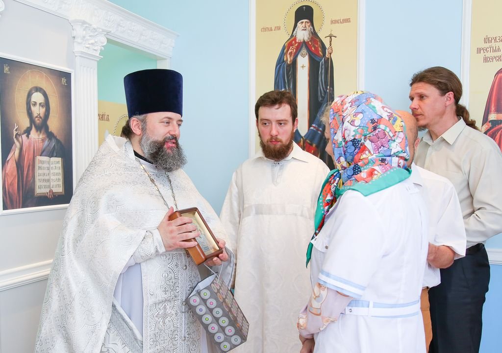 По окончании богослужения отец Марк обратился к верующим с пастырским словом и преподнес настоятелю храма протоиерею Сергию Поддубному икону Спасителя. Отец Сергий вручил памятные подарки тем, кто принимал участие в устроении больничного храма.
