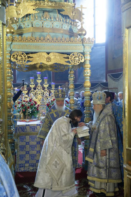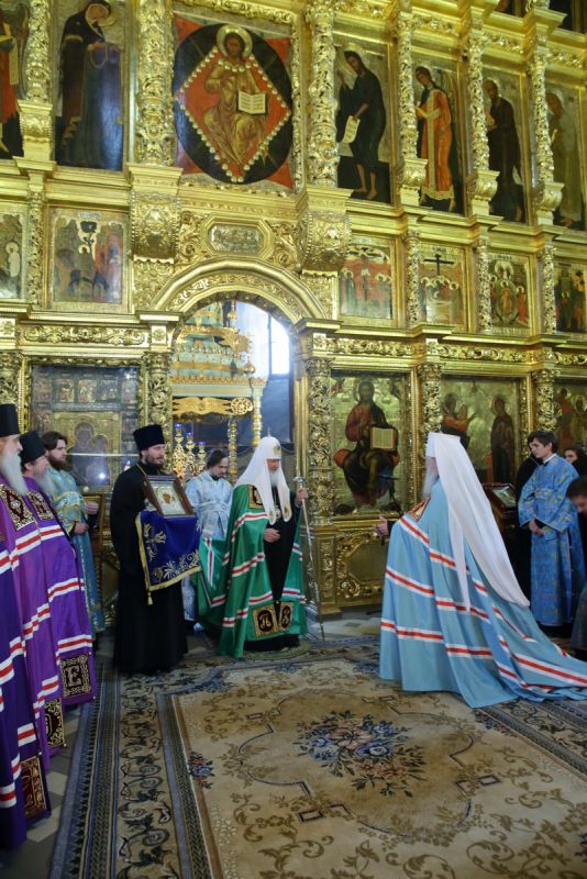 Затем Патриарха Кирилла приветствовал митрополит Ювеналий: «Ваше Святейшество, Святейший Владыка и отец! В этот праздничный и радостный для нас день позвольте обратиться к Вам с приветствием и благодарностью. В природе, когда после ночи появляется солнце, оно все согревает, все освещает, и жизнь жительствует. Что-то подобное происходит и в жизни нашей епархии. Ежегодно Вы, Ваше Святейшество, совершаете Первосвятительское служение в этой древней обители, которая уже сегодня готовится к своему 500-летию. И как дары солнца, всякий раз мы получаем от вас что-то благодатное: или начинается строительство храма, или реставрация обители. А сегодня Вы принесли особый, божественный, дар и нашей епархии, и Церкви Христовой, потому что одного из клириков рукоположили в сан епископа. Ваше Святейшество, мы как дети, которые хотят не богатыми дарами, а дарами сердца своего порадовать Вас, думали о том, что можно Вам на молитвенную память сегодня преподнести. После возрождения монашеской жизни в Новодевичьем монастыре здесь возрождаются традиционные ремесла, и сегодня сестры обители подготовили для Вас образ Заступницы Усердной – икону Казанской Божией Матери, которую они искусно, с любовью и усердием, изготовили. Примите вместе с нашей глубокой сердечной сыновней благодарностью этот образ, и пусть Царица Небесная хранит Вас честным Своим омофором на многая и благая лета».