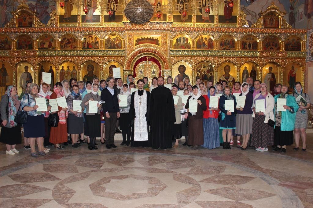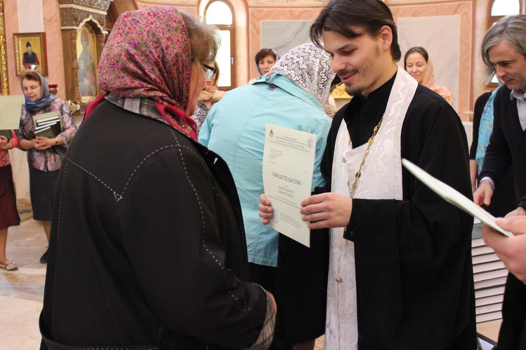 25 мая в Троицком храме г. Реутова состоялось награждение выпускников Библейско-богословских курсов им. прп. Сергия Радонежского. После благодарственного молебна клирик храма священник Алексий Рябиков и преподаватели курсов диакон Михаил Бычков и Сергей Хома вручили свидетельства об окончании обучения.