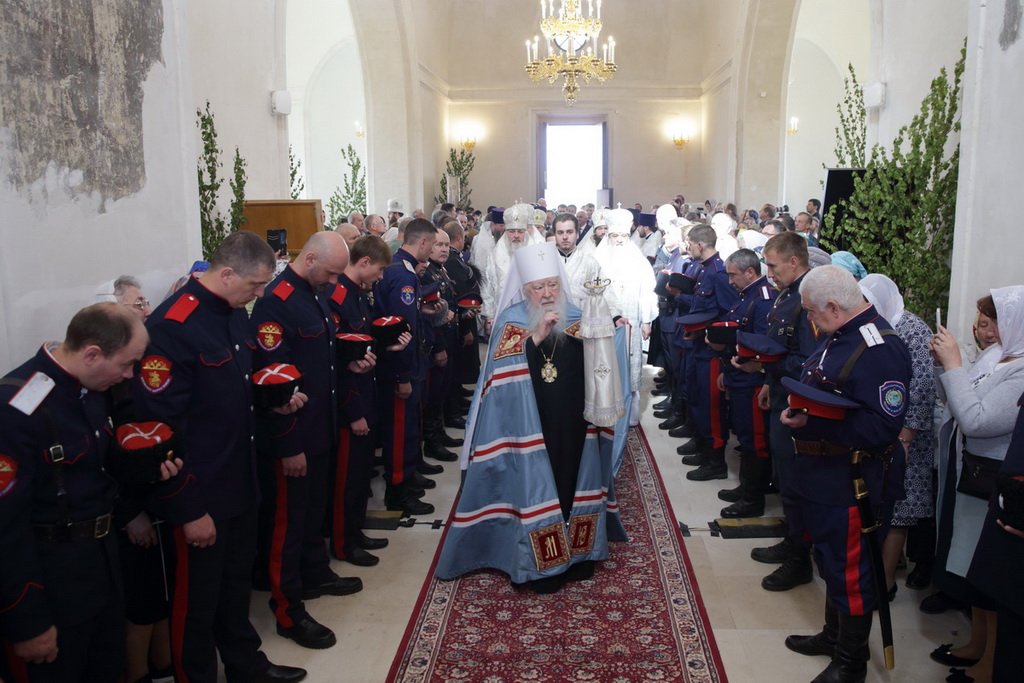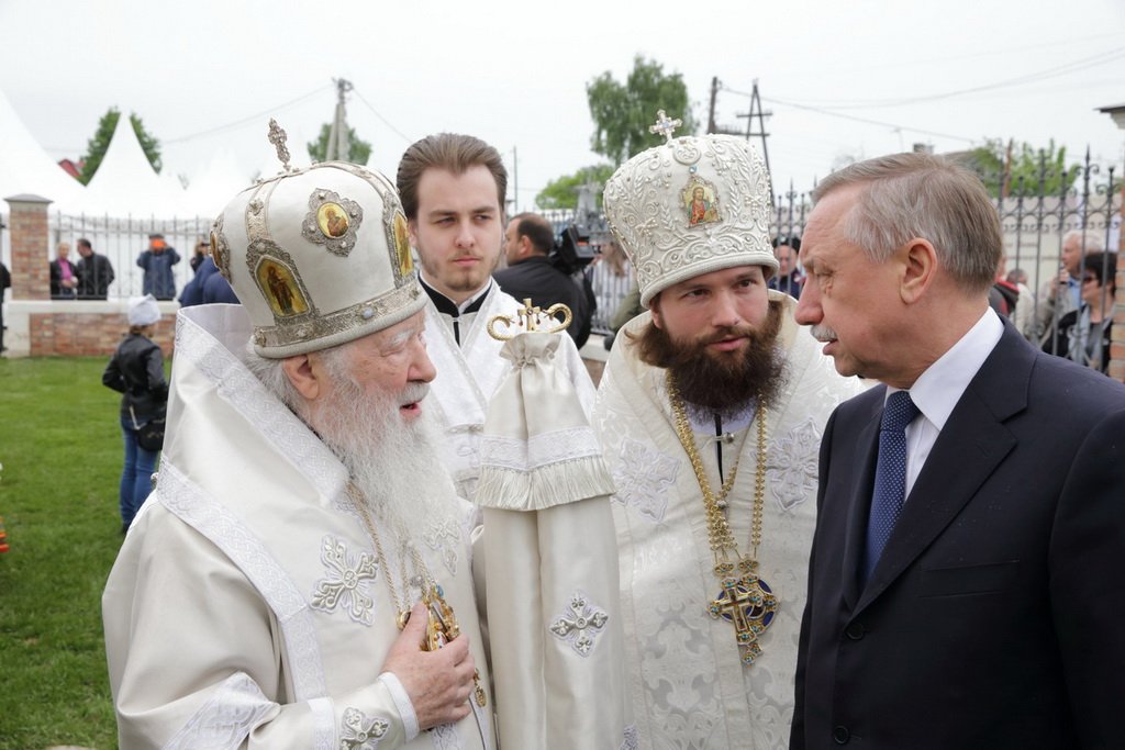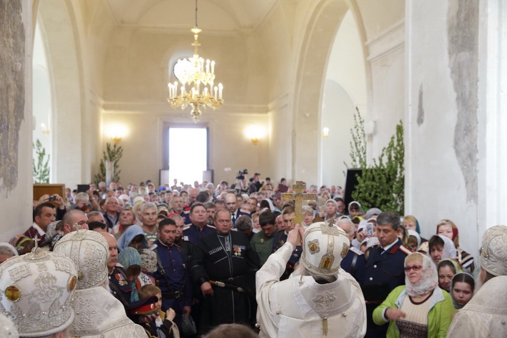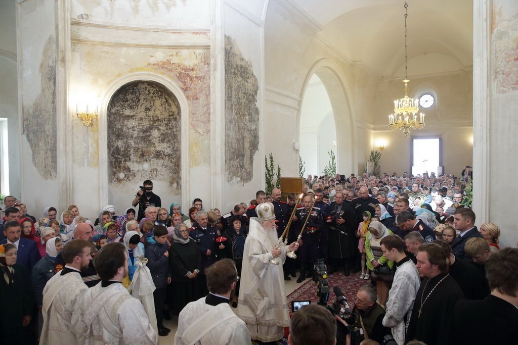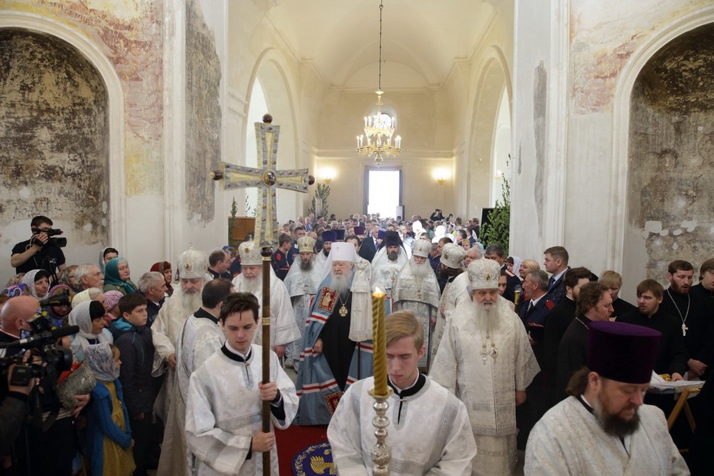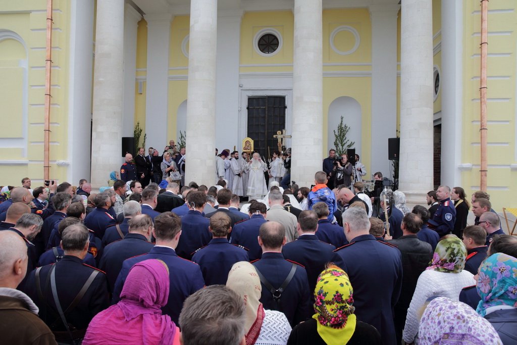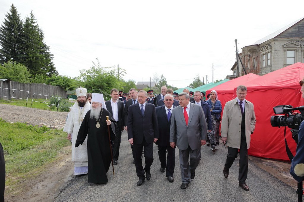 По заамвонной молитве состоялся крестный ход, в завершение которого на паперти храма со словами приветствия к митрополиту Ювеналию обратился А. Д. Беглов: «Ваше Высокопреосвященство, досточтимые Владыки, отцы честные, братья и сестры, братья казаки! Дорогой Владыка Ювеналий, хотел бы всех поздравить с престольным праздником сошествия Святого Духа на апостолов. Огромное Вам спасибо за то, что вы сегодня освятили этот храм. Сюда будут приходить люди не только из этого поселка, но и из окрестных деревень. Будут молиться и спасаться. Я хотел бы поблагодарить всех участников восстановления этого храма. И Вас, Владыка, и Попечительский совет, и благотворителей, и простых прихожан, которые длительное время принимали участие в востановлении порушенного храма. Хотел бы сказать слова благодарности и строителям, которые качественно восстанавливали порушенную святыню. В день престольного праздника этого храма я хотел бы от лица Попечительского совета и благотворителей преподнести настоятелю ковчег со святыми мощами. Большое всем спасибо, всех с праздником!»