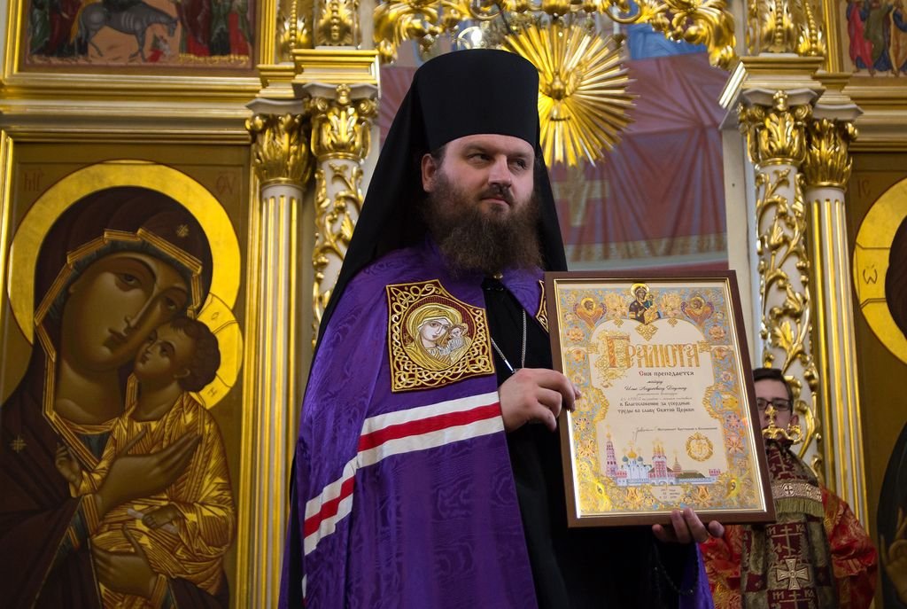 Затем к присутствующим обратился епископ Зарайский Константин. Он передал протоиерею Марку Ермолаеву благодарственное письмо министра образования Московской области М.Б. Захаровой и вручил ряду военнослужащих и сотрудников силовых структур награды Московской епархии за усердные труды на благо Святой Церкви и развитие взаимодействия в области духовного просвещения.