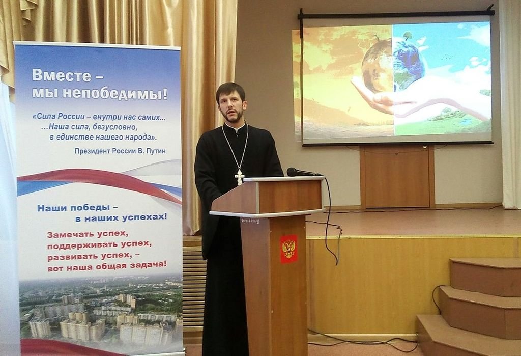 5 декабря в актовом зале гидрометеорологического техникума г.о. Балашихи состоялся круглый стол «Экология. Безопасность. Жизнь», посвященный закрытию экологического марафона. Встреча была организована молодежным центром «Мы вместе» совместно с гидрометеорологическим техникумом и храмом во имя Новомучеников и исповедников Церкви Русской в мкр. Кучино. В мероприятии приняли участие член общественной палаты г.о. Балашиха, главный тренер сборной Московской области по регби на колясках А. Казаков, настоятель храма Новомучеников и исповедников Церкви Русской священник Иоанн Афанасьев, ответственный за экологическую работу в Балашихинском благочинии, сотрудники молодежного центра «Мы вместе» и студенты Подмосковного колледжа «Энергия» и гидрометеорологического техникума. Отец Иоанн выступил с докладом «Экологическая культура-составляющая нравственного облика человека».