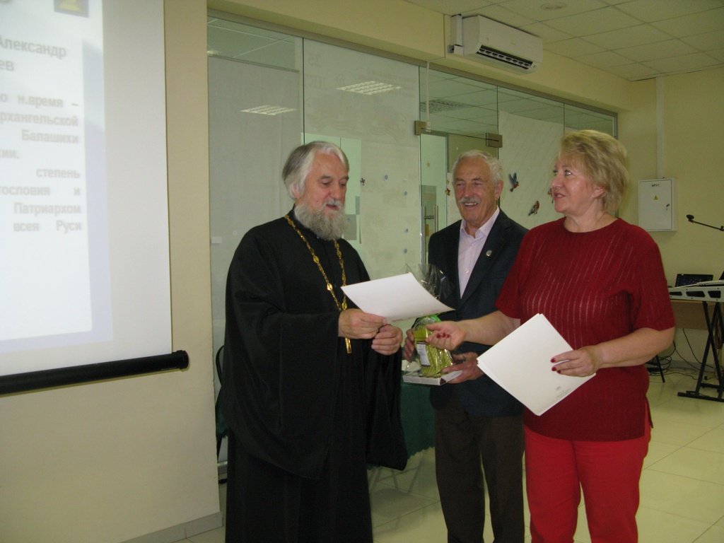 27 июля в помещении Фонда социальной поддержки населения г. Реутова чествовали представителей объединения реутовских краеведов. От имени администрации г. Реутова директор музейно-выставочного центра А.С. Кошкина поблагодарила краеведов за высокие достижения в культурно-просветительской деятельности и вручила благодарственные грамоты и подарки. Грамота была вручена и протоиерею Александру Козыреву – клирику Николо-Архангельского храма г. Балашихи. В ответном слове отец Александр поздравил присутствующих с праздником 1030-летия Крещения Руси.