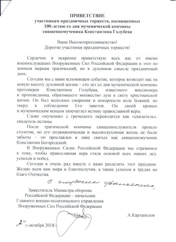 Сегодня начали праздновать 100-летие со дня мученической кончины одного из замечательных святых нашего времени - священномученика Константина Голубева, благочинного, одного из первых новомучеников. В первую очередь передаю вам благословение нашего Правящего архиерея - Владыки митрополита Ювеналия.