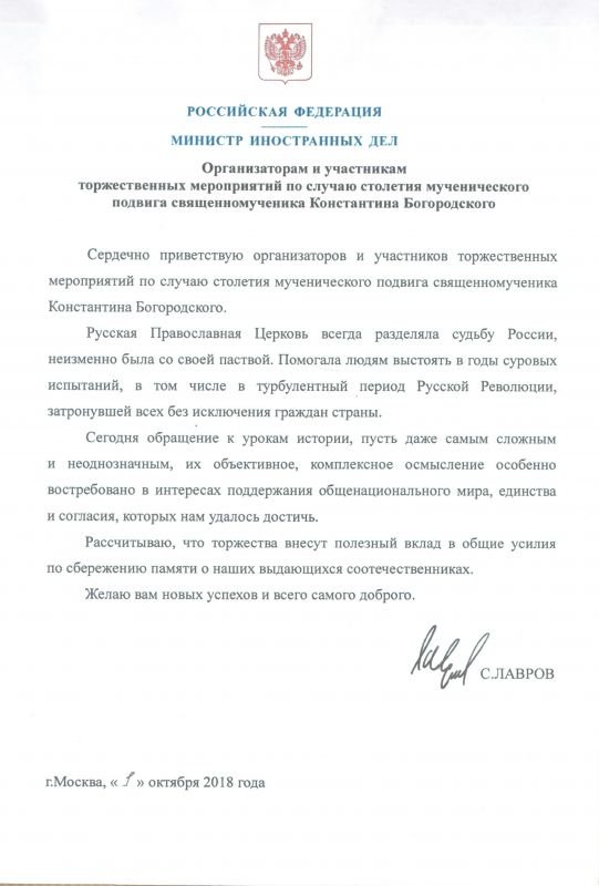 Приветствия в адрес митрополита Ювеналия и всех участников торжеств направили министр иностранных дел Российской Федерации Сергей Лавров и заместитель министра обороны Российской Федерации - начальник главного военно-политического управления Вооруженных сил Российской Федерации генерал-полковник Андрей Картаполов.