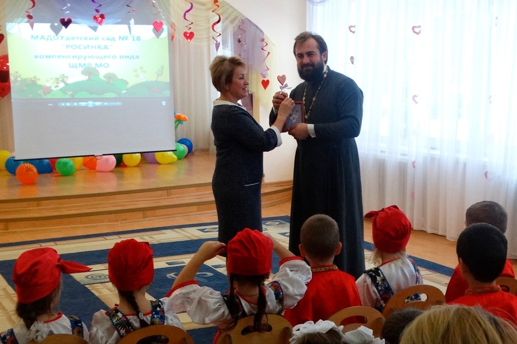 3 декабря в детском саду № 18 «Росинка» компенсирующего вида г. Щелково прошел «Праздник добрых сердец». С пожеланиями к собравшимся обратились заведующая детского сада М.А. Зверева, главный эксперт сектора дошкольного образования Т.П. Банникова, настоятель Серафимовского храма г. Щелково священник Виталий Крикота. В конце мероприятия дети получили подарки.