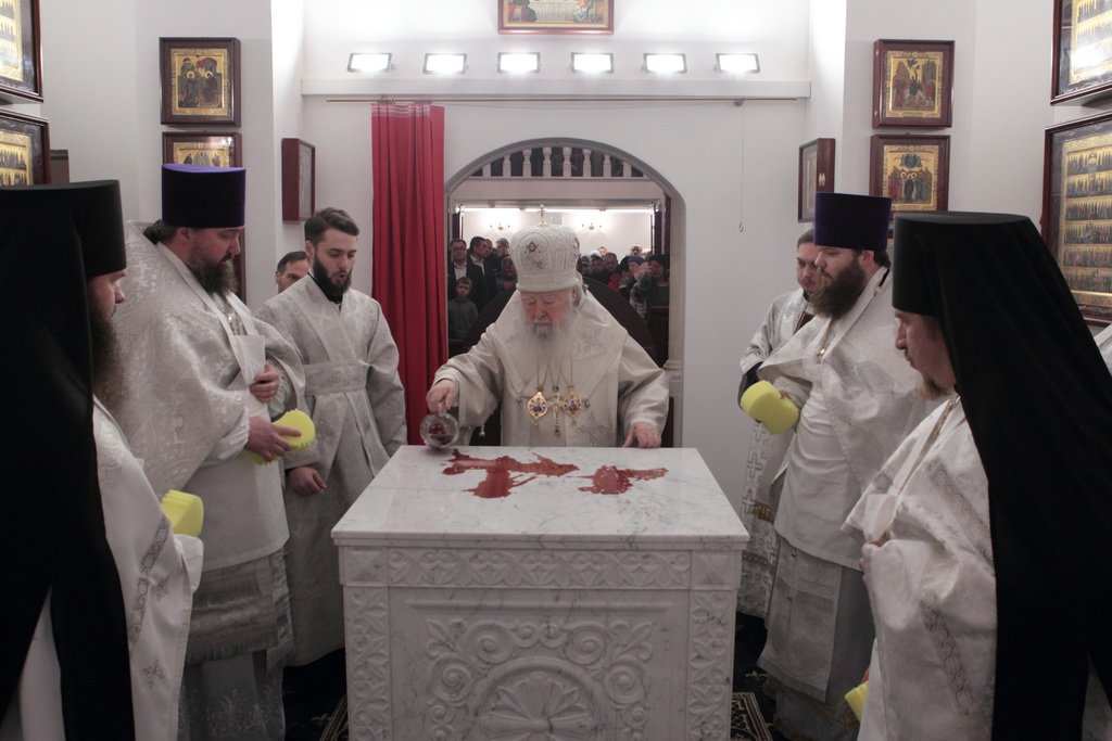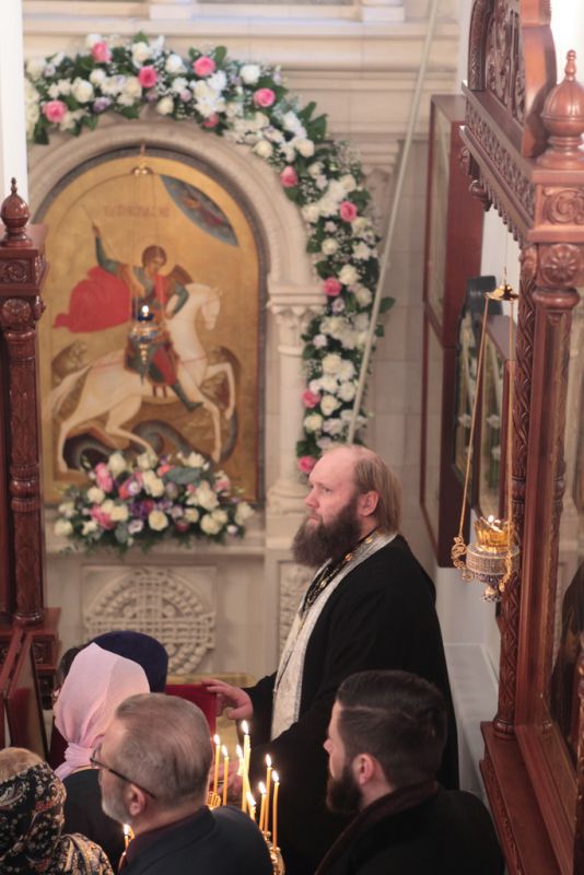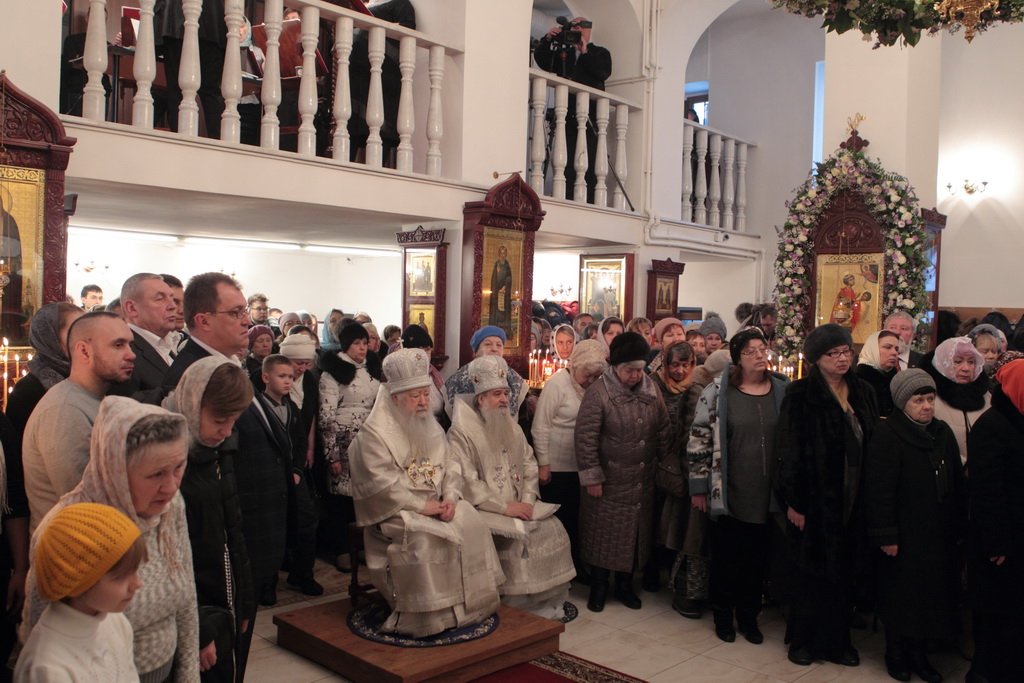 Ваше Преосвященство, всечестные отцы, представители гражданских властей, дорогие братья и сестры! С большой радостью я сегодня посещаю этот приход. Помню, как в 2010 году, по моему благословению, Владыка Роман на этом месте освящал основание будущего храма. Отец Михаил Ялов, который был тогда благочинным, всячески помогал и возглавлял строительство этого храма. Через три года сюда назначен был отец Александр, нынешний настоятель, для которого уже было уготовано место для богослужения. А начало всему положил отец Михаил. А в народе говорят: хорошее начало — половина дела. Эта пословица полностью подходит к строительству этого храма, потому что отец Александр одновременно занимался продолжением строительства храма и начал богослужения. Здесь создалась дружная община. Все здесь украшено множеством икон: их сейчас в храме 150. Это редкое явление. Когда освящается храм, обычно встречаешь пустые стены и немного народа. Возлюбленный отец Александр за эти годы не только украсил этот храм святыми образами, но собрал приход и создал воскресную школу. И сегодня при входе в храм меня приветствовали ее ученики. Все здесь сделано для того, чтобы только продолжать церковную жизнь. И я согласен с тобой, дорогой отец Александр, что нужно много проявлять внимания и заботы для воспитания детей, которые бы с раннего возраста познали любовь Божию, в сердце своем имели веру в Господа и потому были бы счастливы с детства. Мне хочется всех вас поблагодарить за участие, а особенно жертвователей, потому что для этого храма жертвовали не только прихожане, но и представители государственной власти. Можно сказать, что этот храм воздвигнут, как в народе говорят, всем миром. Я низко кланяюсь вам. Благодарю всех вас за труды, благодарю строителей и проектировщиков, которые построили этот необычный храм. Здесь тепло для души, здесь хорошо молиться. И мне в этот торжественный момент хочется вручить особо потрудившимся Патриаршие и епархиальные награды. Однако, прежде всего я хочу поблагодарить отца Александра за его приветствие, за его служение, за его прекрасный дар, который будет мне напоминать о сегодняшнем дне. А в этом месте великомученик Георгий Победоносец и блаженная Матрона Московская будут особыми покровителями для тех, кто будет приходит на молитву с тем, чтобы получить просимое для временной и вечной жизни.