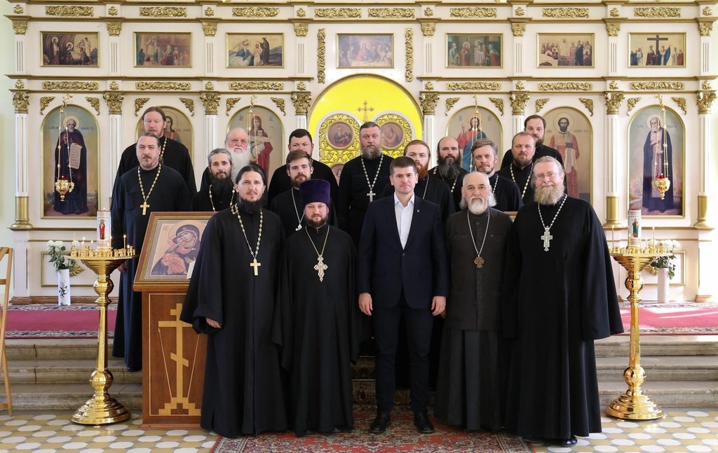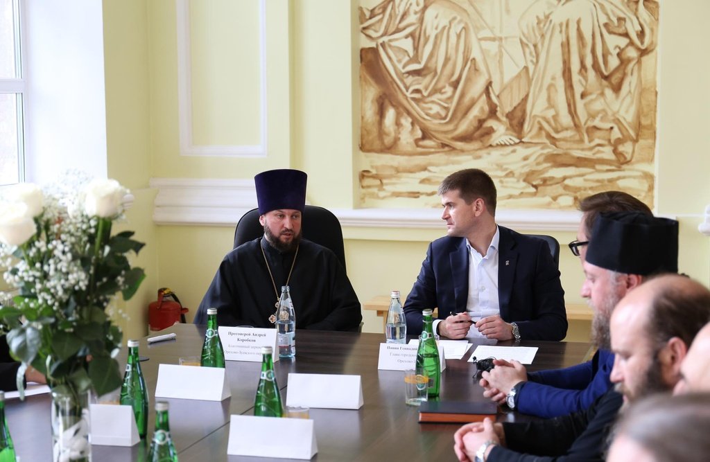 16 июля в Никольском храме г. Орехово-Зуево состоялась рабочая встреча благочинного протоиерея Андрея Коробкова и духовенства благочиния с главой городского округа Орехово-Зуево Г. О. Паниным. Перед началом встречи был совершен молебен святителю Николаю Чудотворцу и Царственным страстотерпцам. В ходе встречи настоятели храмов округа задали Г. О. Панину различные насущные вопросы, каждый из которых он взял на контроль для дальнейшего их разрешения.