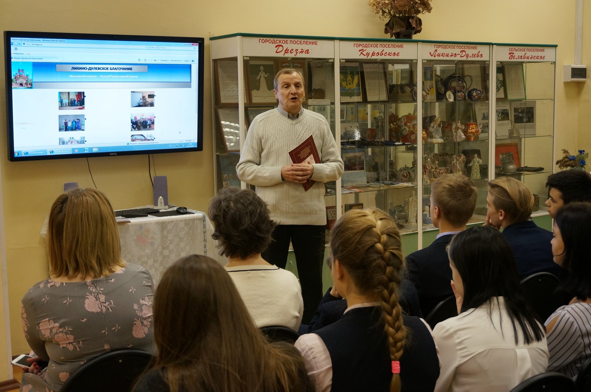 26 декабря в филиале Ликино-Дулевского краеведческого музея состоялся открытый урок для восьмиклассников г. Ликино-Дулево из цикла «Храмы Ликино-Дулевского благочиния». Урок провели директор музея И. П. Ширина, лектор С. В. Хромов и помощник настоятеля храма Иоанна Богослова г. Ликино-Дулево Е. А. Шалманов.