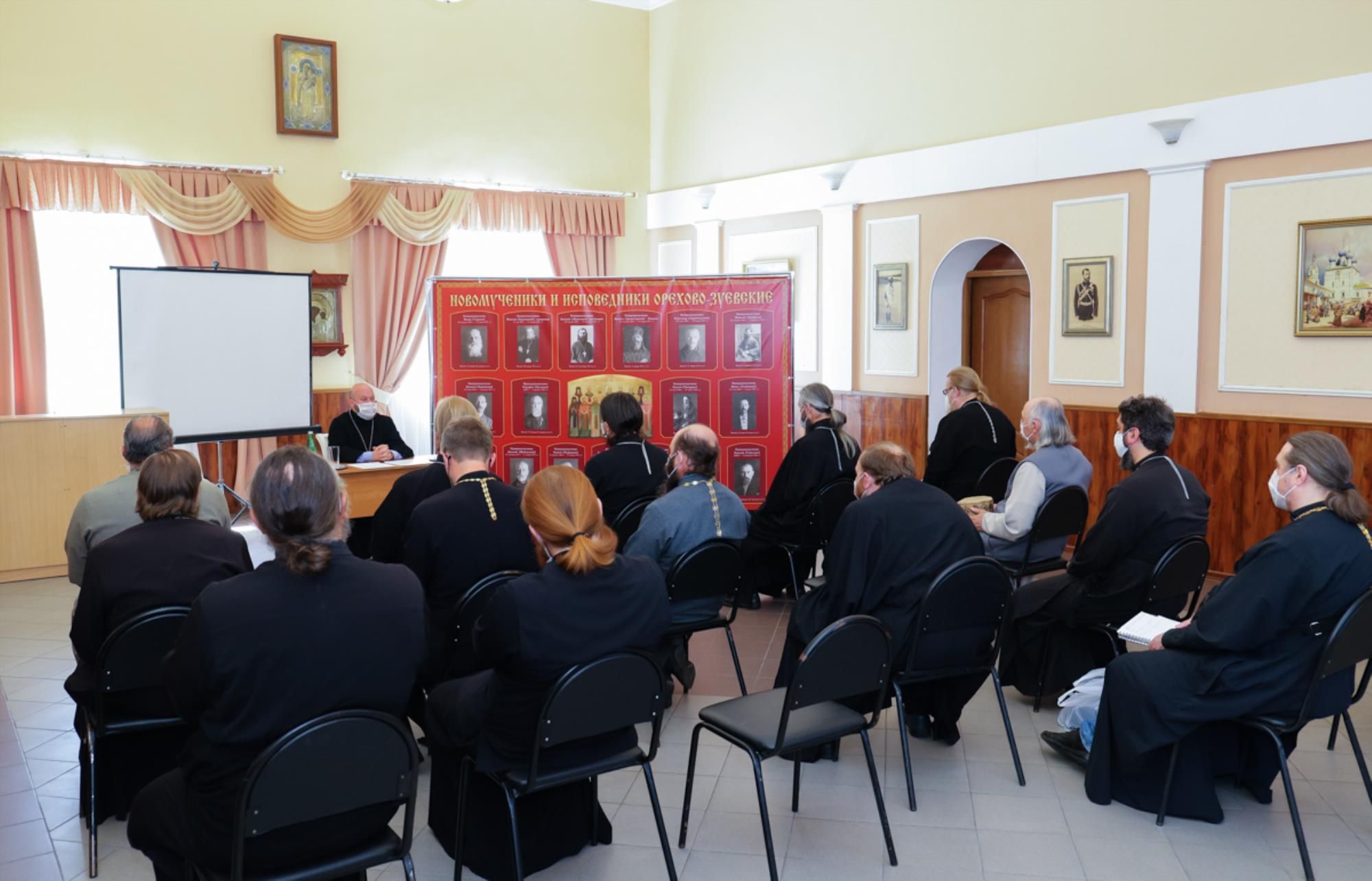 22 июня в духовно-просветительском центре «Благовест» при Богородицерождественском соборе г. Орехово-Зуево под председательством благочинного протоиерея Андрея Коробкова состоялось братское совещание духовенства Орехово-Зуевского церковного округа. Духовенство было проинформировано о содержании циркуляров и распоряжений Управляющего Московской епархией митрополита Крутицкого и Коломенского Ювеналия и о профилактических мерах на приходах благочиния, принятых в связи с пандемией. В рамках братского совещания состоялся Пастырский семинар на тему «Порядок чинопоследования совершения отпевания. Решение недоуменных вопросов при совершении чинов погребения».
