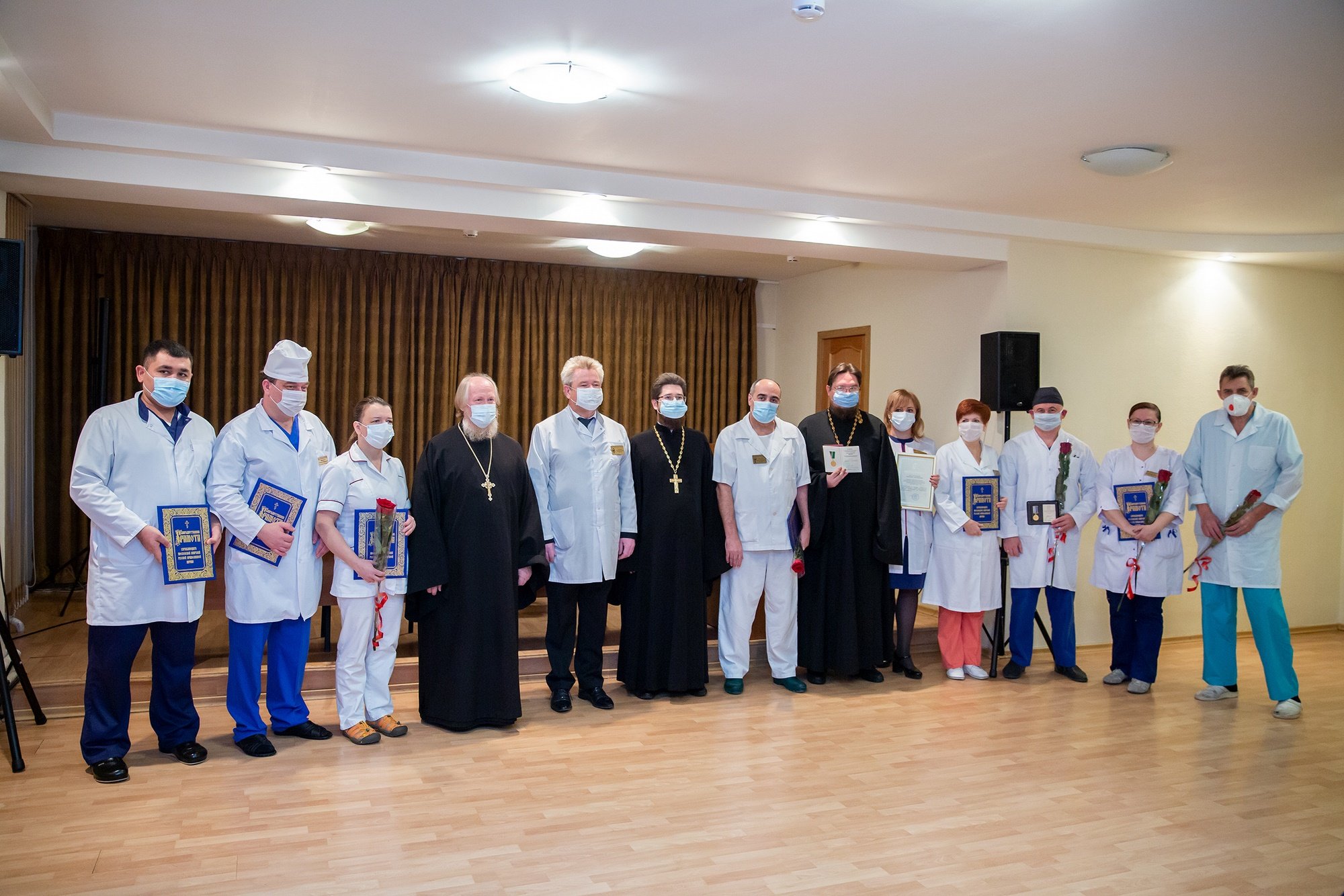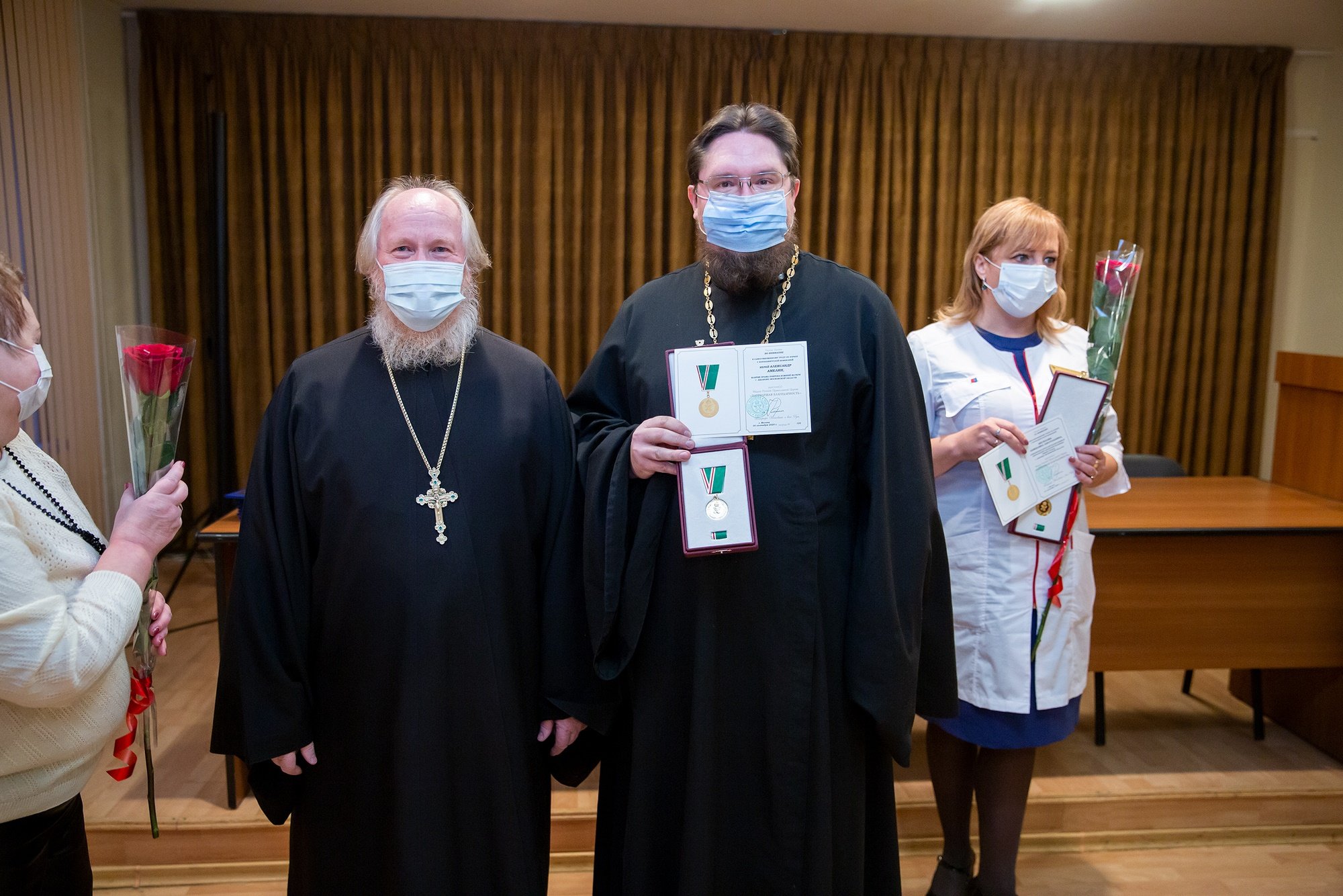 27 ноября благочинный церквей Щелковского округа протоиерей Андрей Ковальчук вместе со своим заместителем священником Димитрием Третьяковым посетили Центральную городскую больницу имени М.В. Гольца г. Фрязино, где вручили Патриаршие и Епархиальные награды врачам, медсёстрам и духовенству благочиния, несущим попечение о заболевших коронавирусной инфекцией.