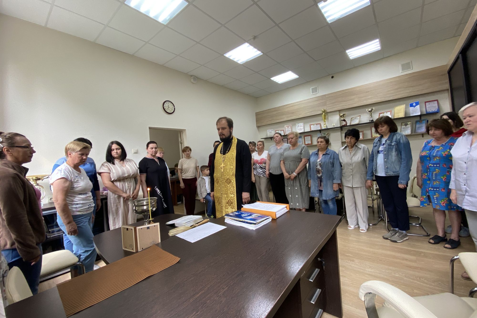 7 июня клирик Троицкого собора г. Щелково священник Евгений Трушин совершил чин освящения центра творческого развития и гуманитарного образования «Романтик» г. Щелково. На освящении присутствовали директор В. М. Волотка и сотрудники центра.