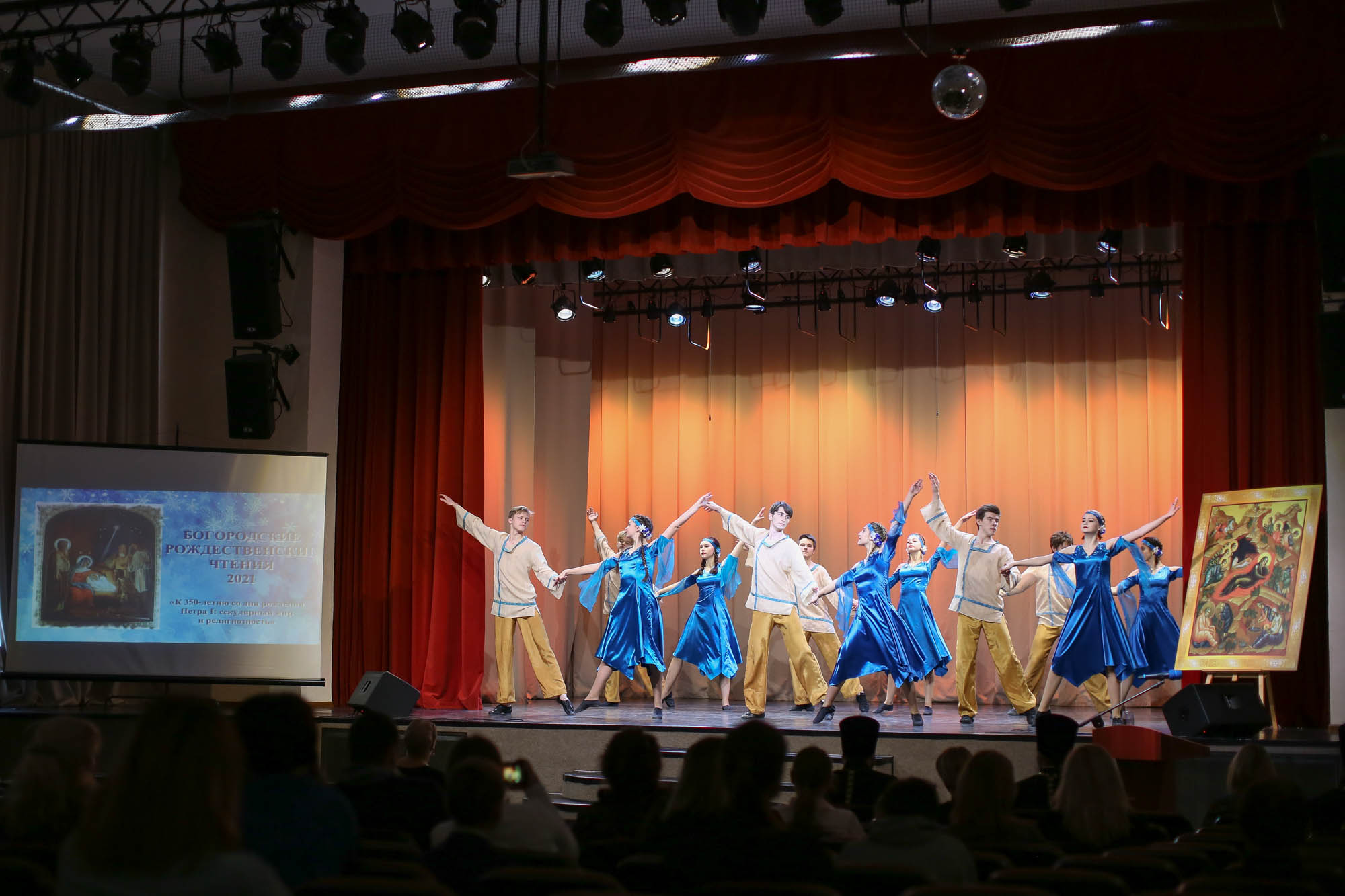 В фойе была представлена выставка работ участников творческого конкурса «Святыни и светочи земли Богородской».