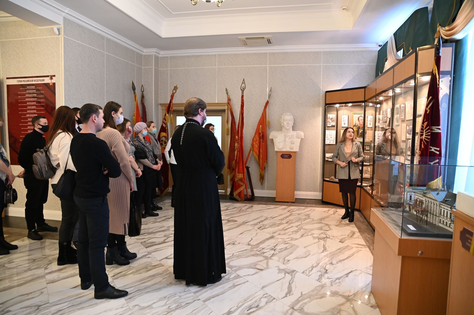 После посещения экспозиции сотрудники УФСИН побывали в храмовом комплексе в честь святого равноапостольного князя Владимира - небесного покровителя войск Росгвардии, который построен в подмосковном городе Балашиха. Встретил гостей настоятель храма протоиерей Максим Беликов. Он рассказал присутствующим о храме и о духовно-просветительской работе с военнослужащими, организовал ознакомительную экскурсию: участники побывали в верхнем храме и в нижнем – в честь Сорока Севастийских мучеников, а также на звоннице.