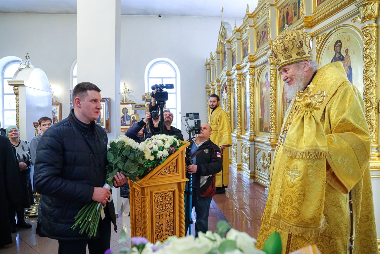 Глава городского округа Павловский Посад Д. О. Семенов поблагодарил Владыку за совершённое богослужение и преподнёс ему картину с изображением Богородицерождественского храма деревни Саурово.