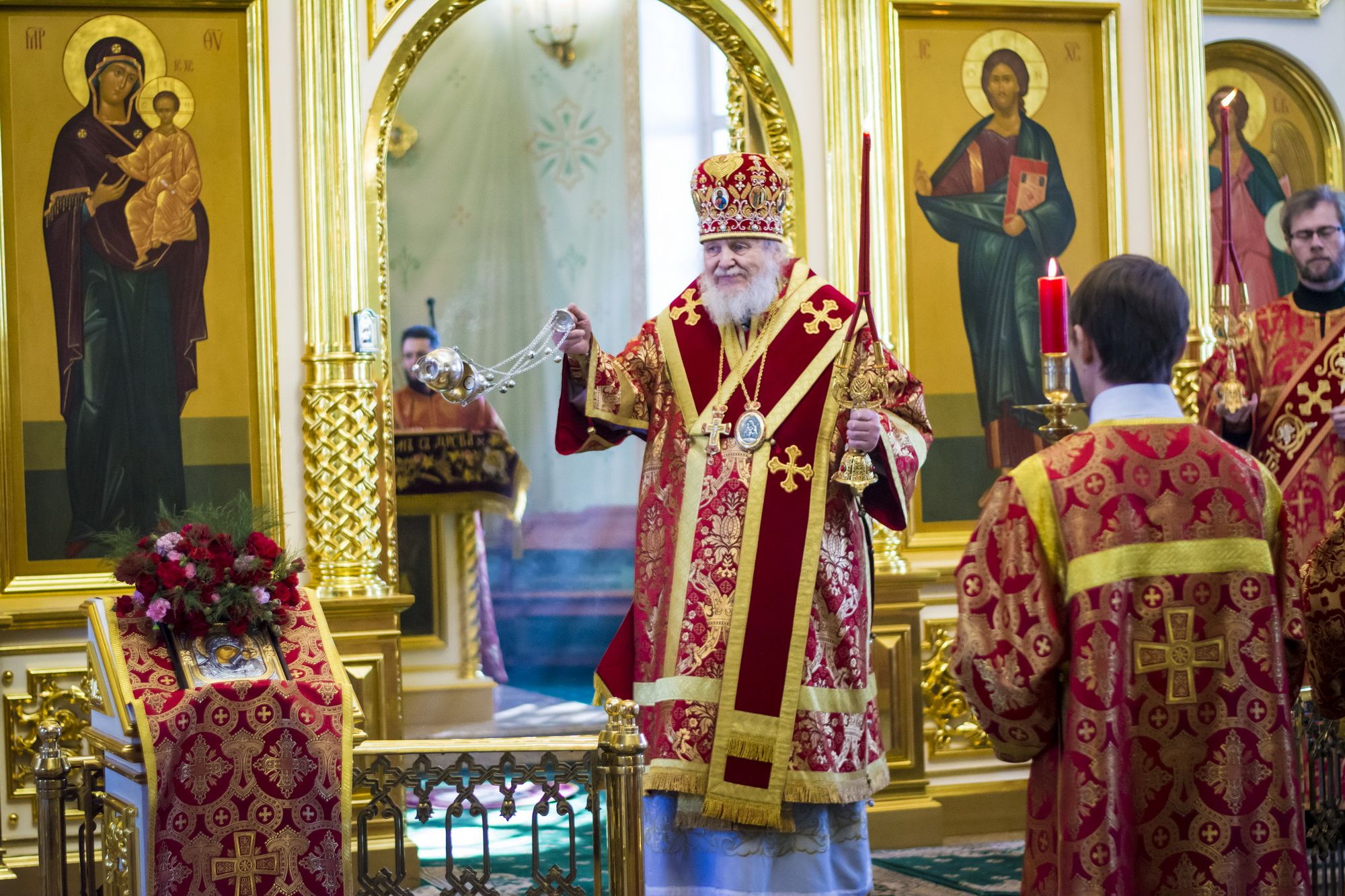 Затем Его Преосвященство обратился к сослужившему духовенству и молящимся с архипастырским словом и преподнес Н. А. Цветкову книгу Патриарха Московского и всея Руси Кирилла.