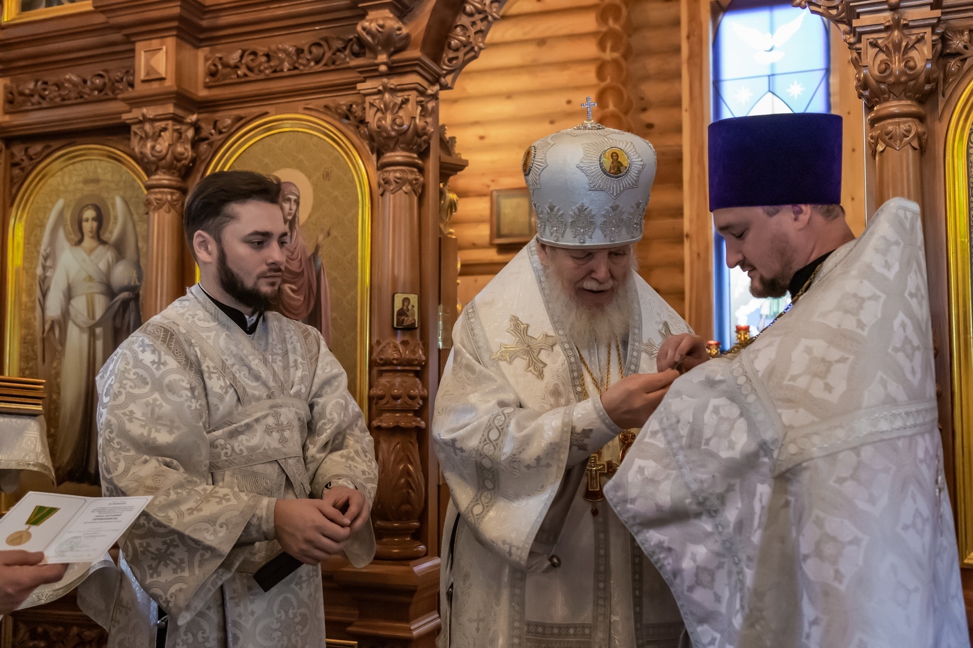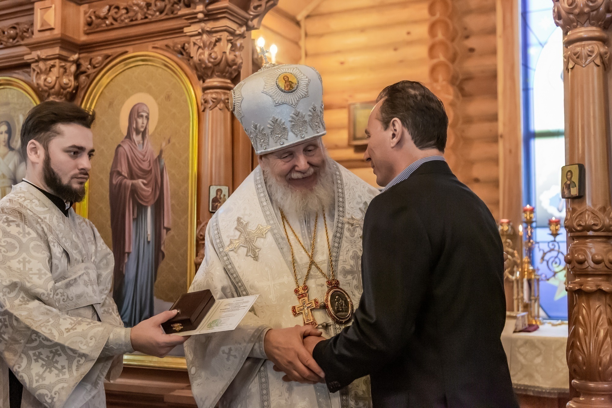 Затем Его Преосвященство обратился к сослужившему духовенству и молящимся с архипастырским словом, после чего вручил церковные награды потрудившимся в деле строительства храма.
