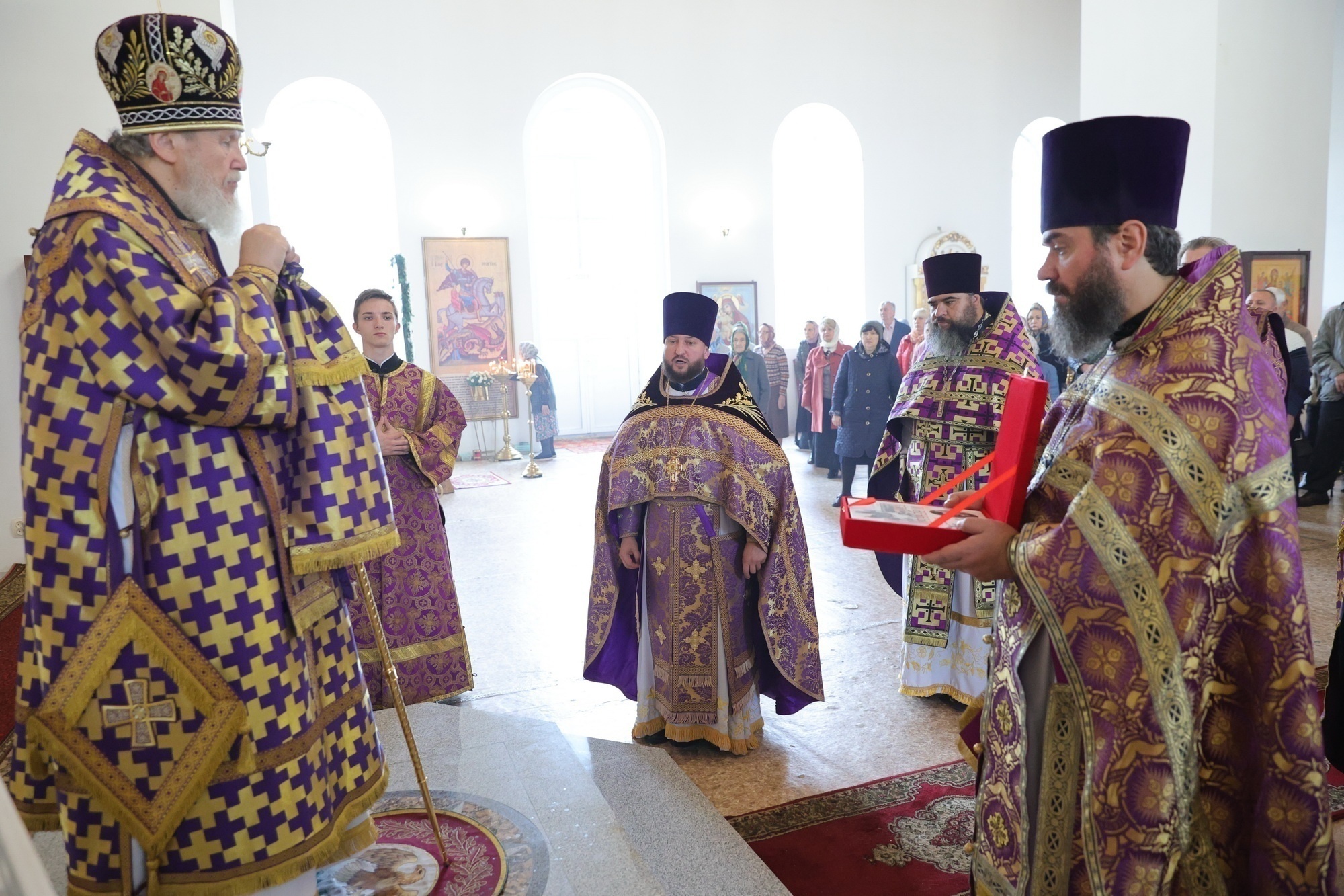 По окончании Литургии отец благочинный поблагодарил Владыку за совершённое богослужение, а отец настоятель преподнёс ему в дар книгу Анатолия Хлопецкого «И вечный бой… Святитель Николай Японский и истоки военных искусств России».