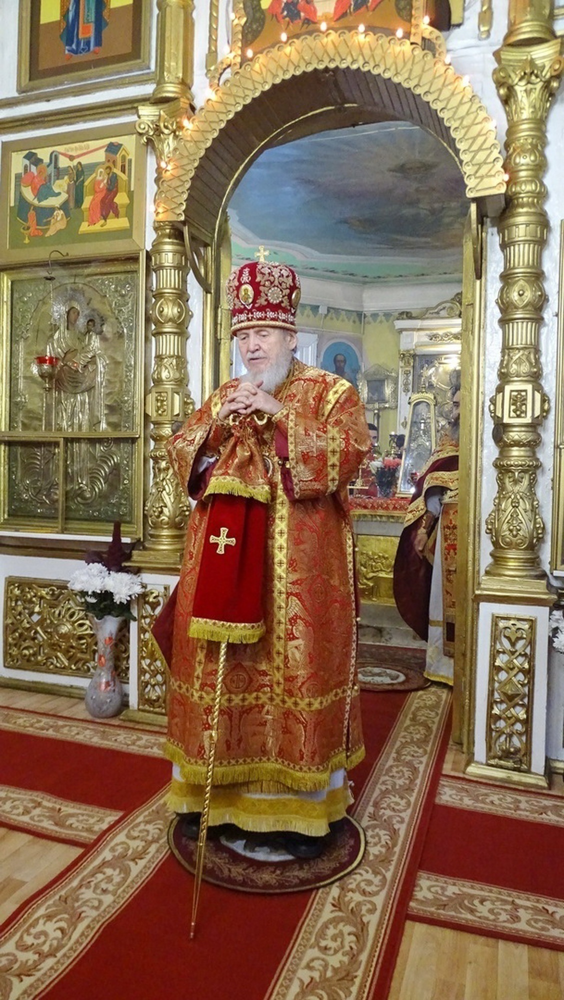 Затем священник Антоний Рыжаков и М. А. Коркин произнесли приветственные слова, а отец настоятель преподнёс в дар Владыке икону великомученика Никиты.