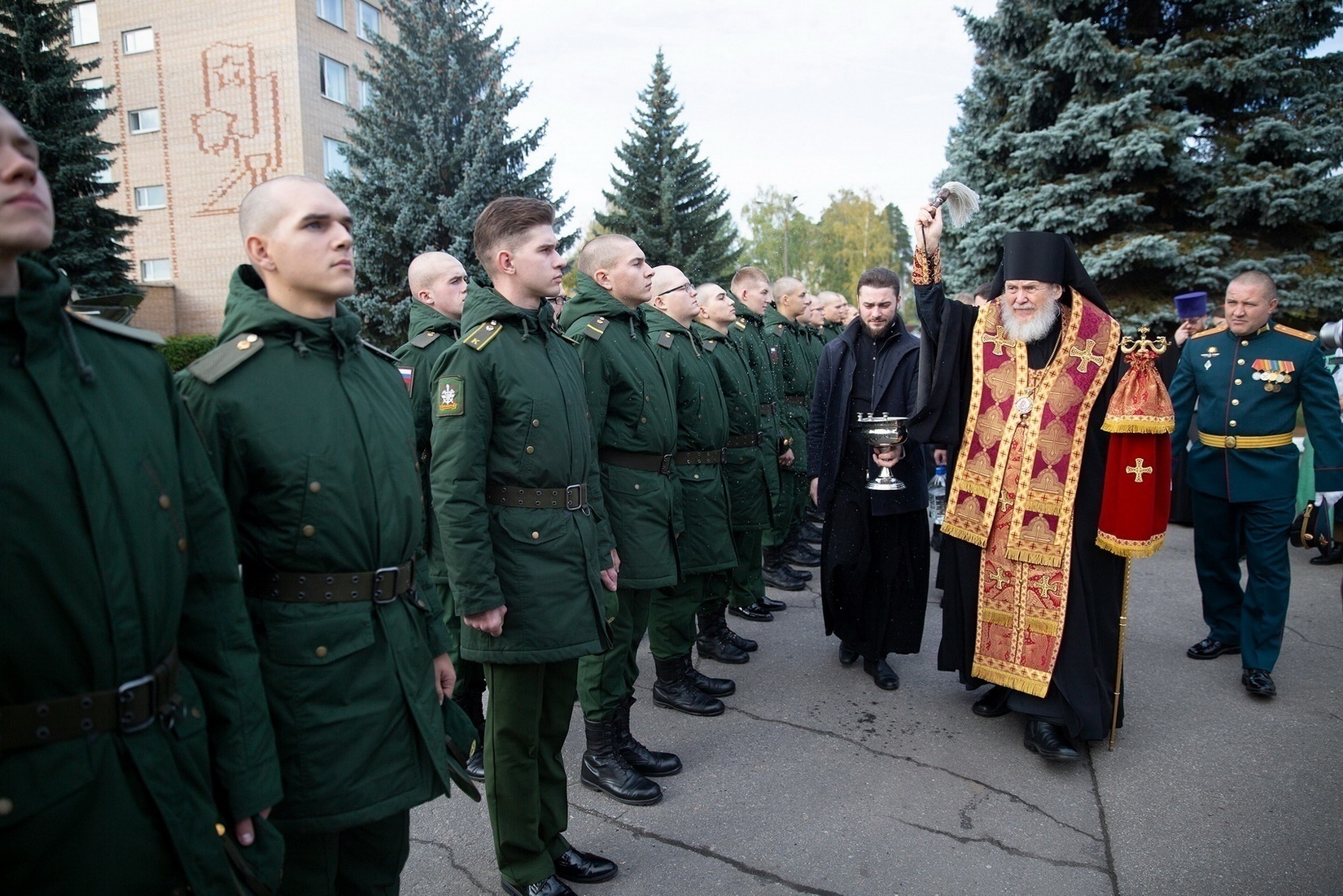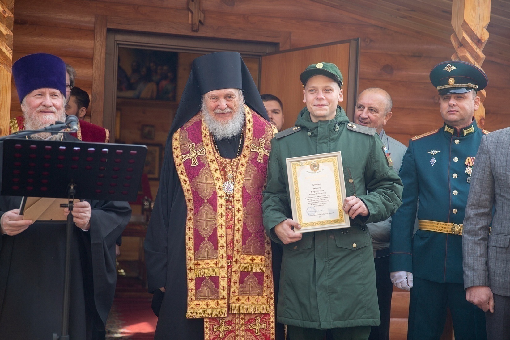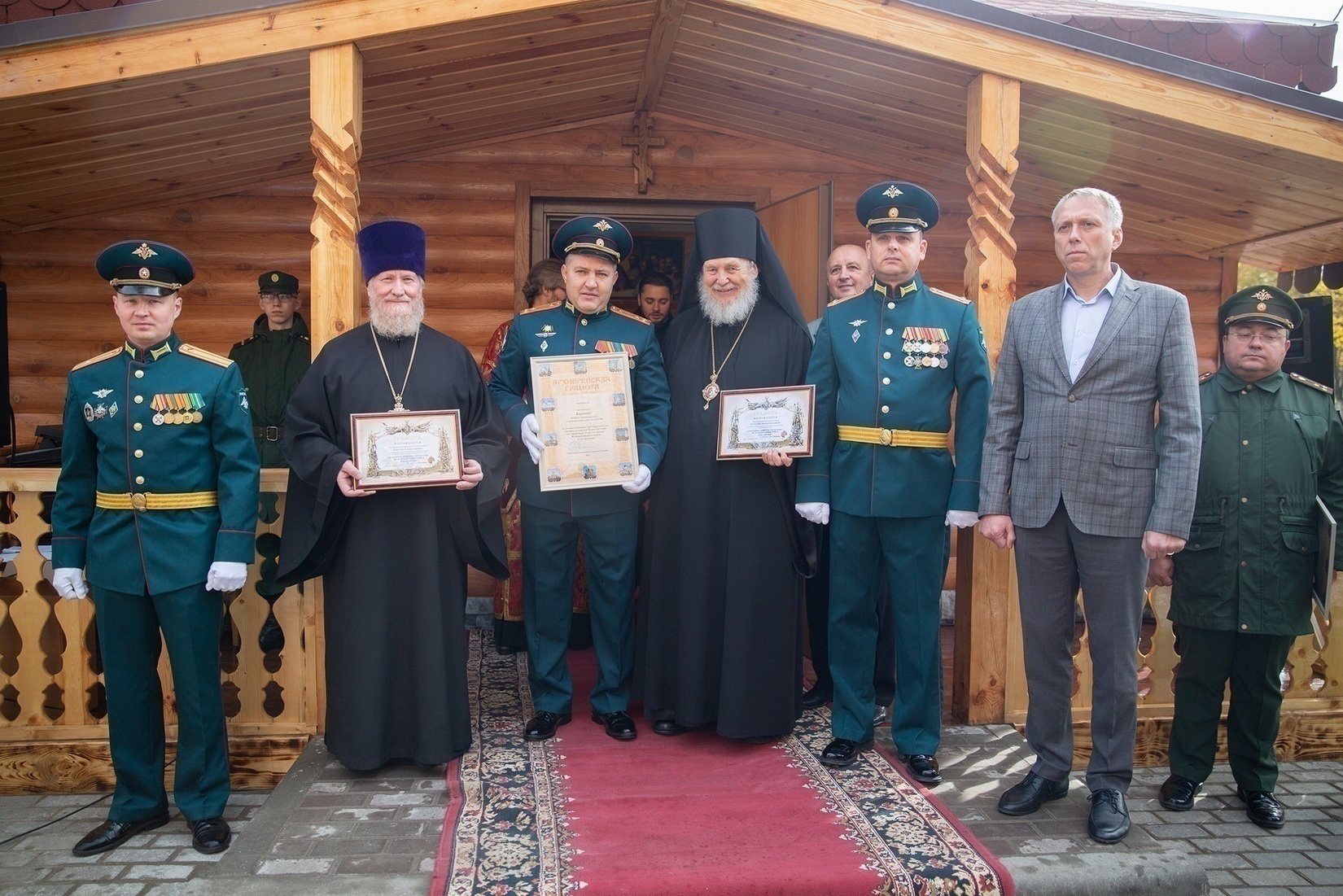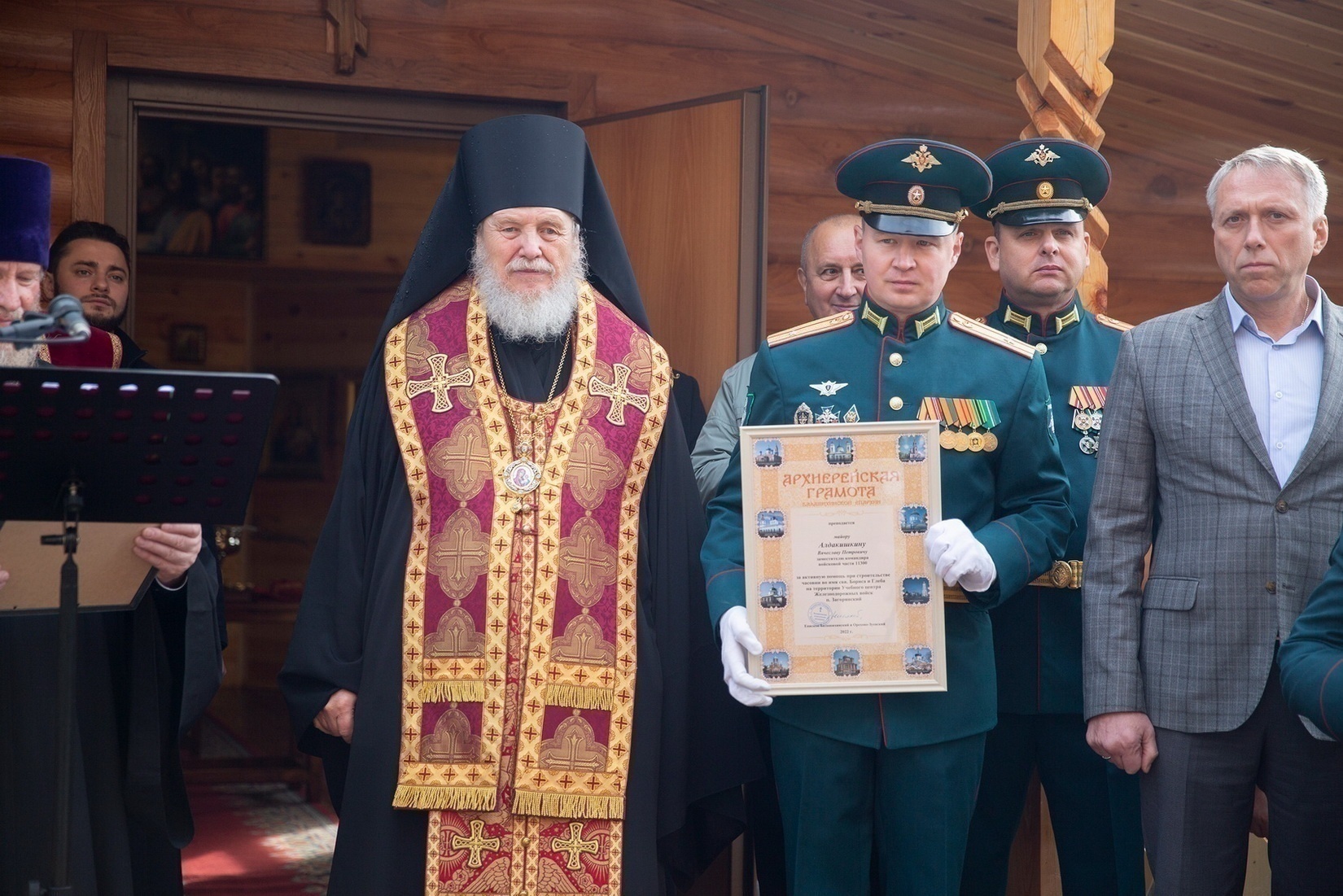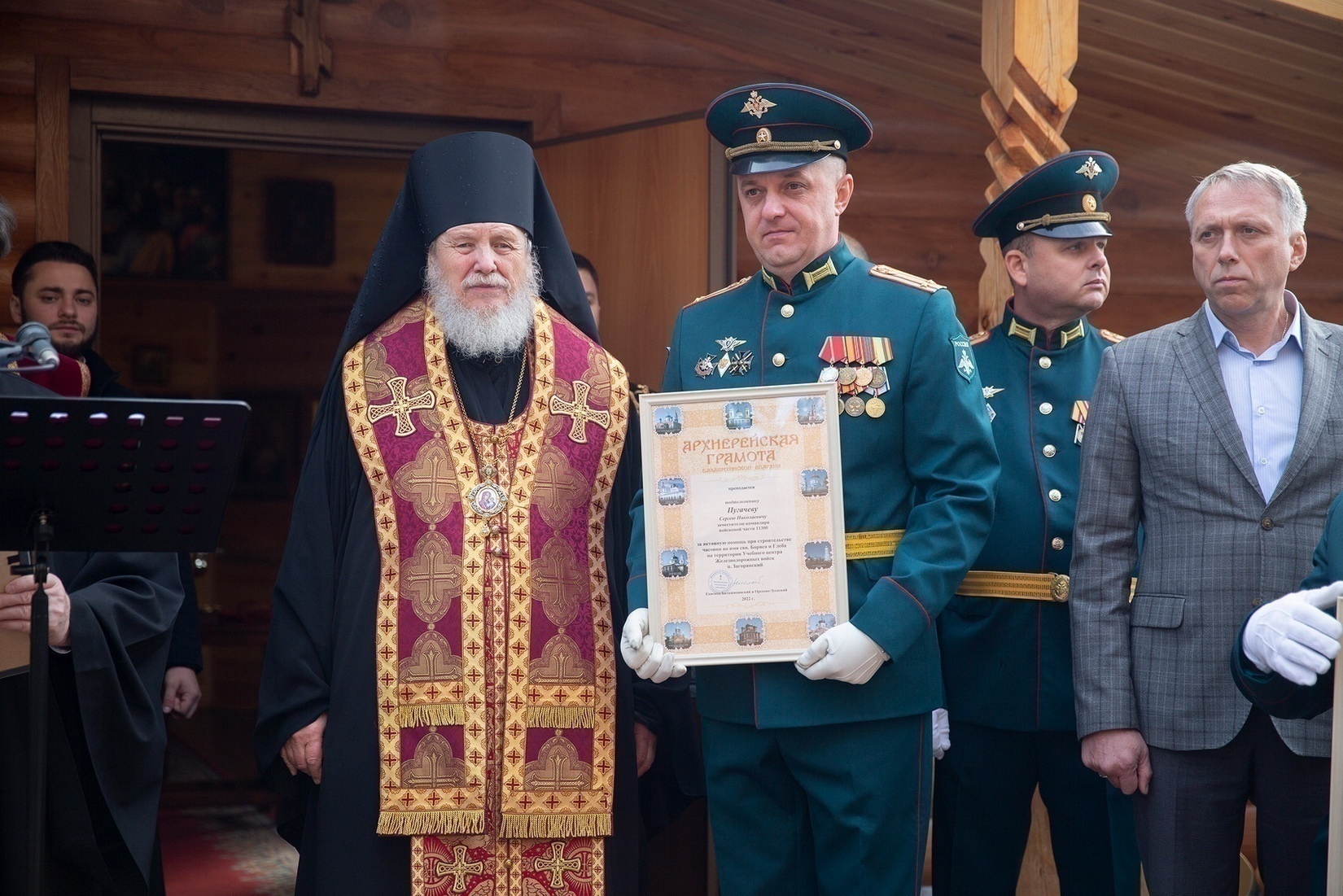 По окончании богослужения Владыка окропил личный состав учебного центра святой водой, после чего вручил Архиерейские и Благодарственные грамоты Балашихинской епархии тем, кто принял наиболее активное участие в строительстве часовни.