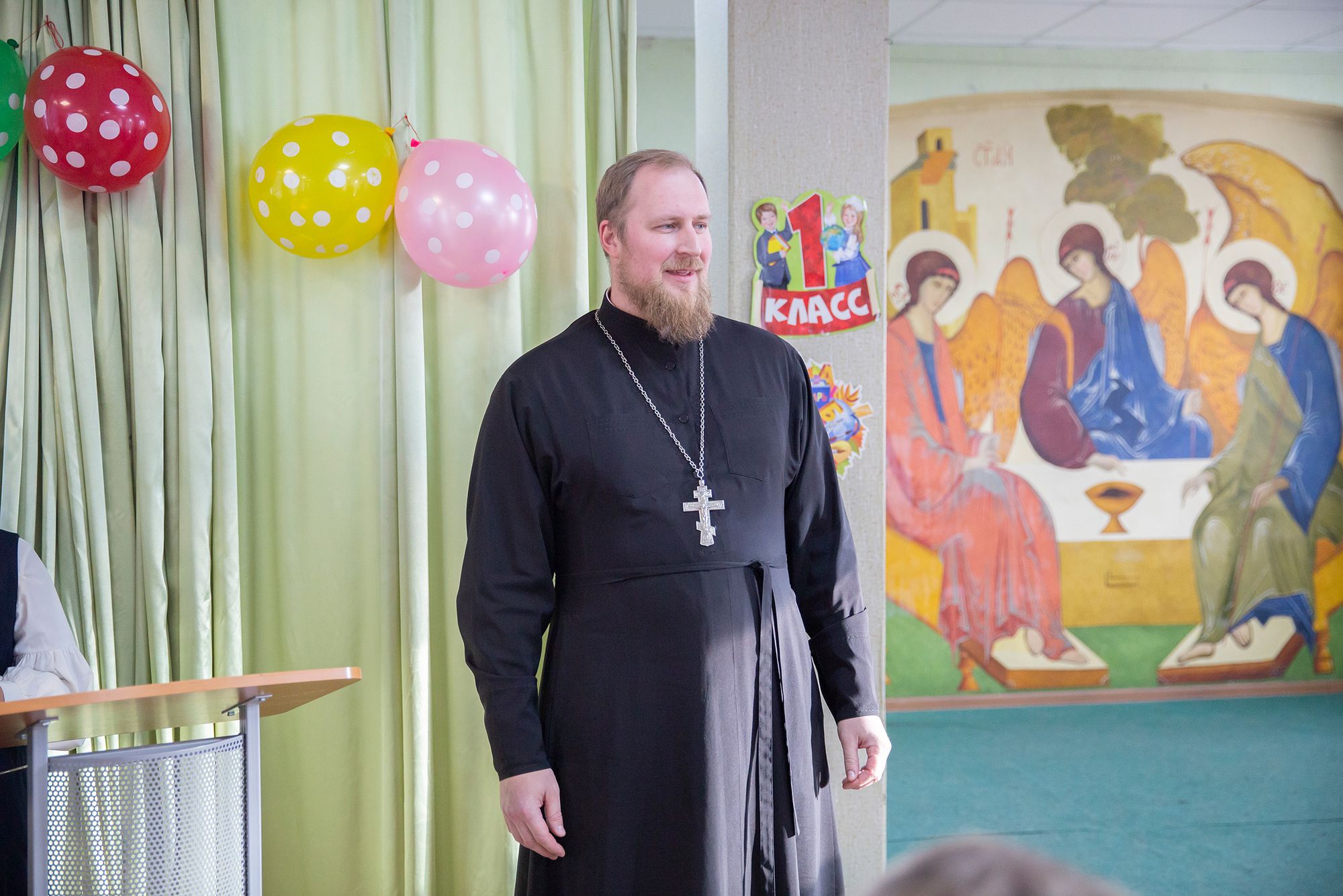 Духовник гимназии священник Павел Чекалин поприветствовал гимназистов и напутствовал их прилежно учиться, не лениться, быть активными, уважать старших, дорожить и беречь традиции гимназии.
