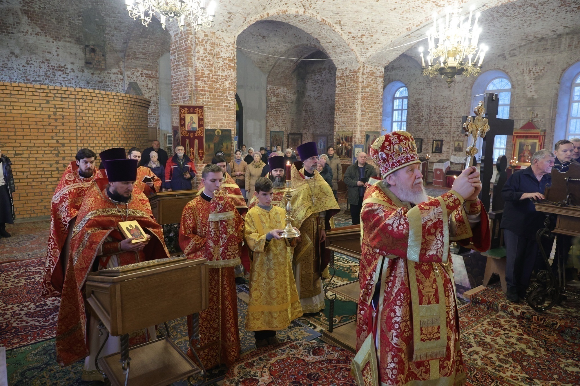По окончании Литургии перед иконой священномученика Александра Архангельского было совершено славление, после чего отец Пётр поблагодарил Владыку Николая за совершённое богослужение и от лица духовенства благочиния преподнёс ему икону Архангела Михаила.