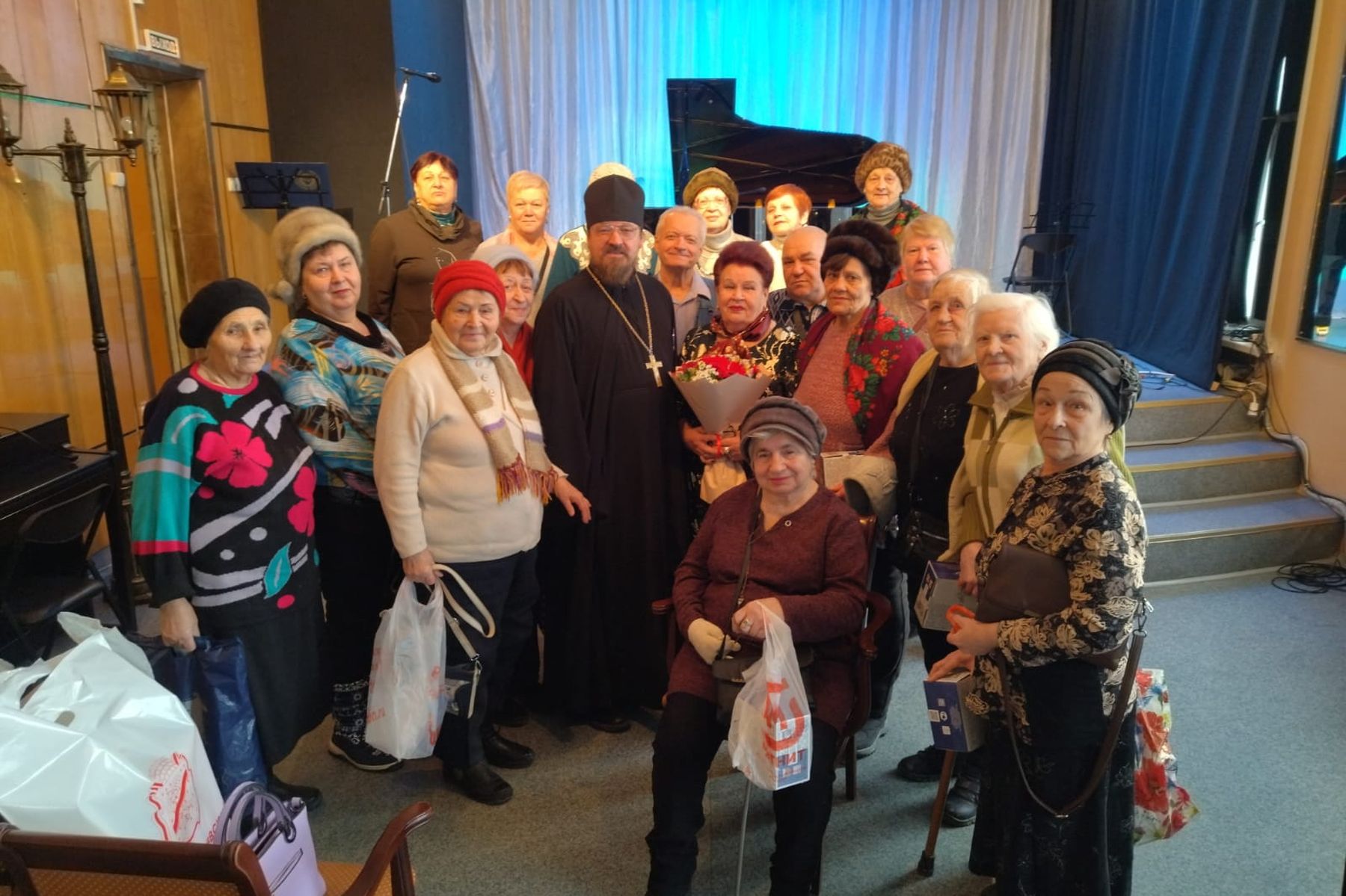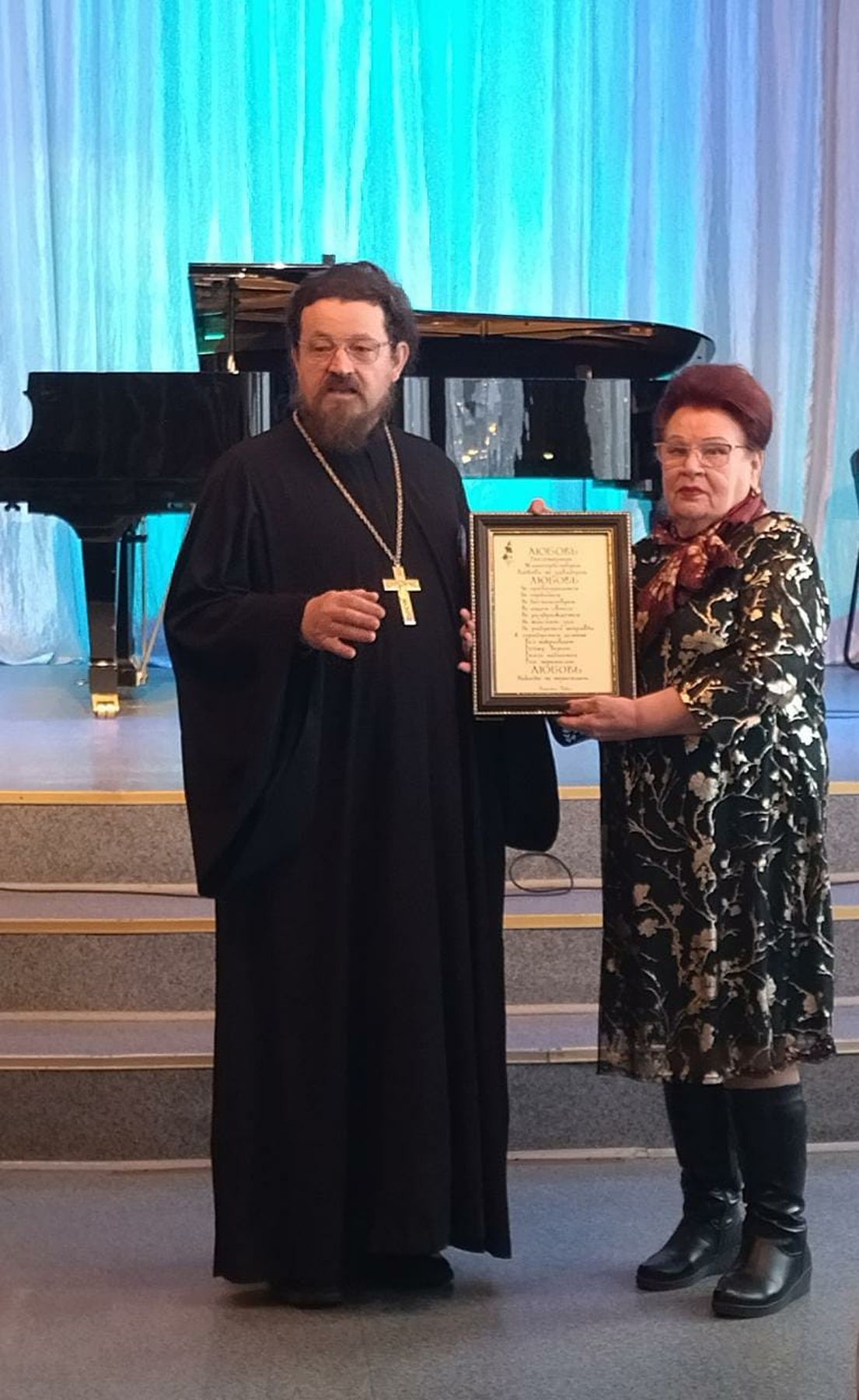 клирик Богородицерождественского собора города Орехово-Зуево священник Вадим Лебедев поздравил присутствующих с праздником и вручил председателю общества инвалидов Р.Н. Климовой каллиграфически исполненный Гимн любви апостола Павла (1 Кор: 1-8) как напоминание о главной цели христианской жизни.