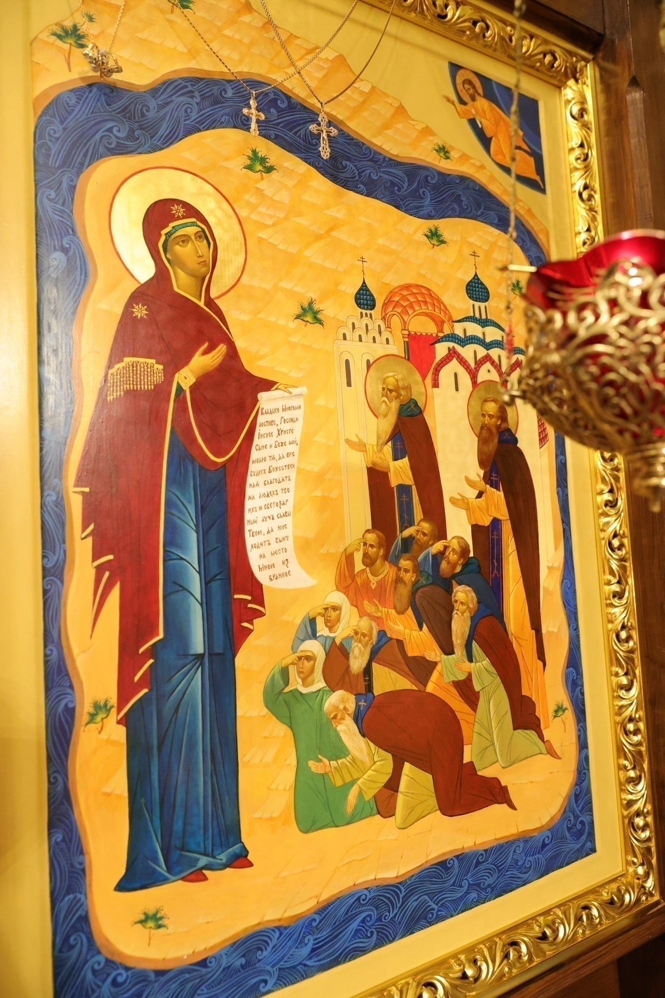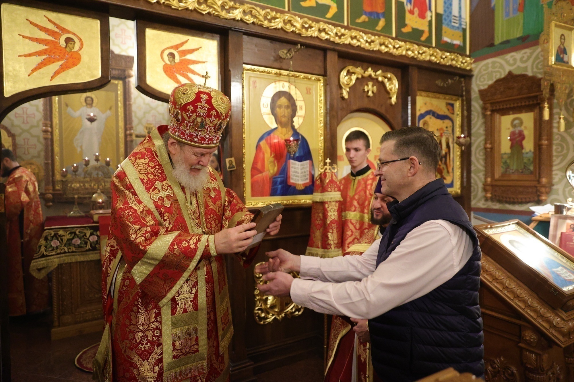 В завершение Литургии отец благочинный поблагодарил епископа Николая за совершённое богослужение, после чего благотворитель храма Дмитрий Витальевич Ширёнов преподнёс Владыке старинную икону Божией Матери «Боголюбская».