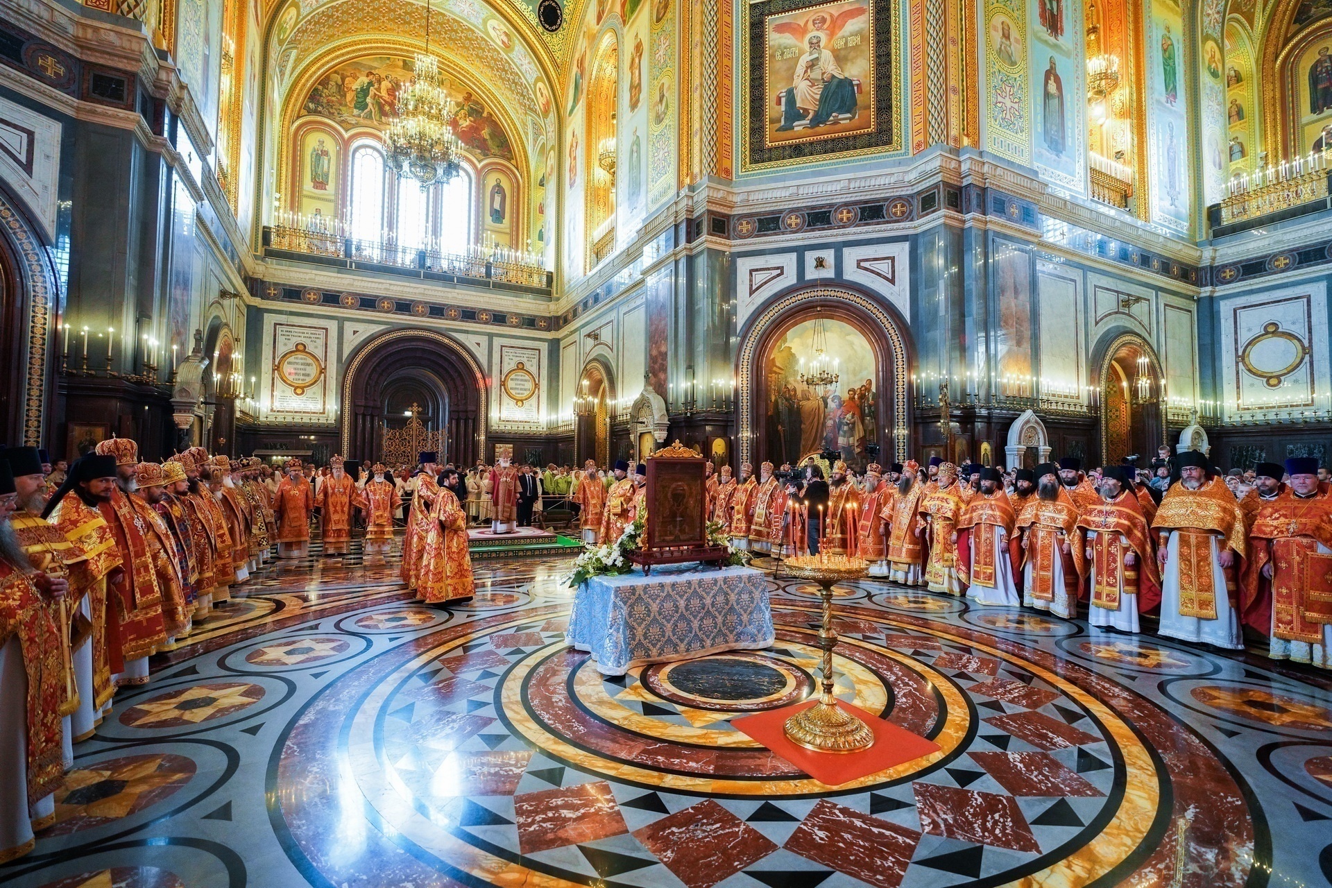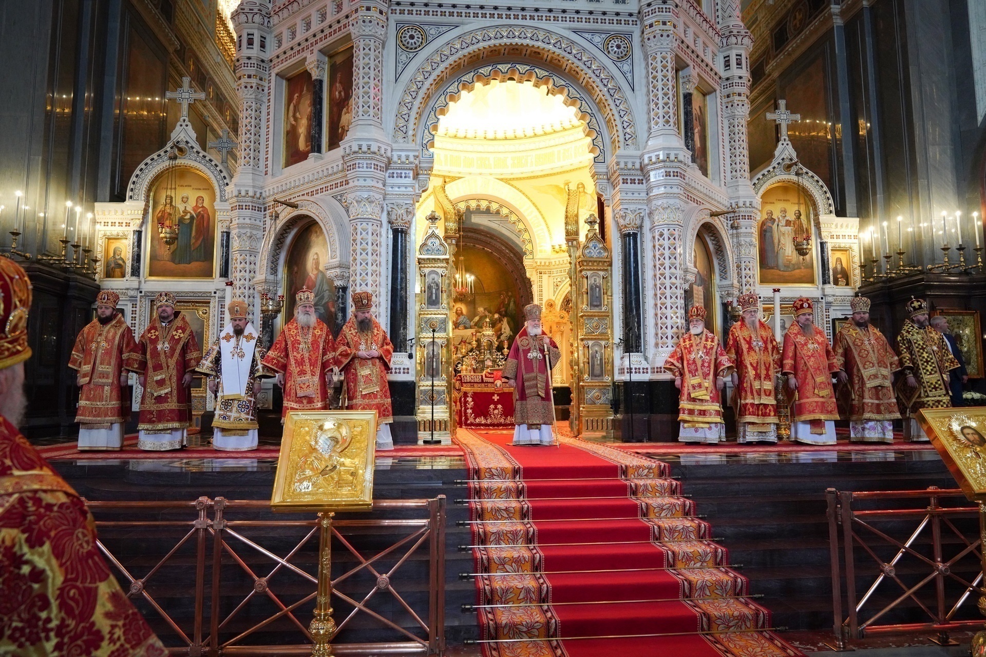 Перед началом Литургии состоялась торжественная встреча чудотворной Феодоровской иконы Божией Матери, которая по благословению Его Святейшества была принесена в Храм Христа Спасителя из Богоявленско-Анастасииного монастыря г. Костромы. Святыня принесена духовенством Костромской епархии во главе с митрополитом Костромским и Нерехтским Ферапонтом.