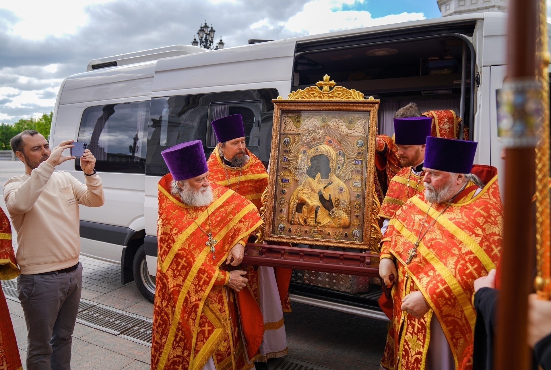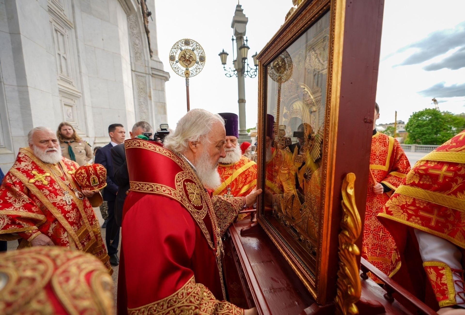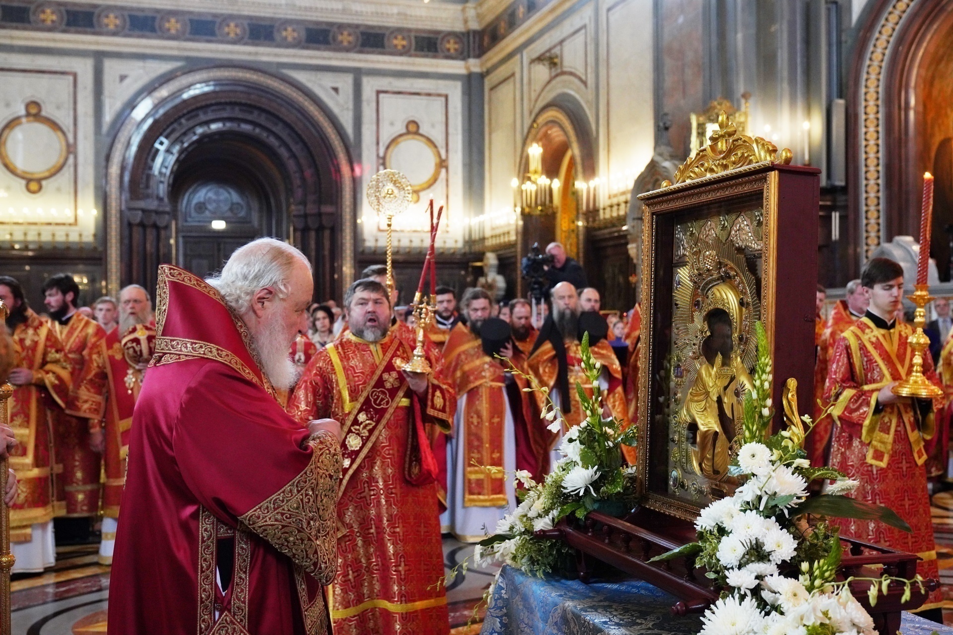 Предстоятель Русской Церкви вышел к западным вратам Храма Христа Спасителя, куда прибыл автомобиль с чудотворным образом. Святейший Владыка приложился к иконе, которую несли священнослужители Костромской епархии. Затем икона была установлена в центре храма. Во встрече святыни приняли участие представители костромской и московской дружин Организации российских юных разведчиков.