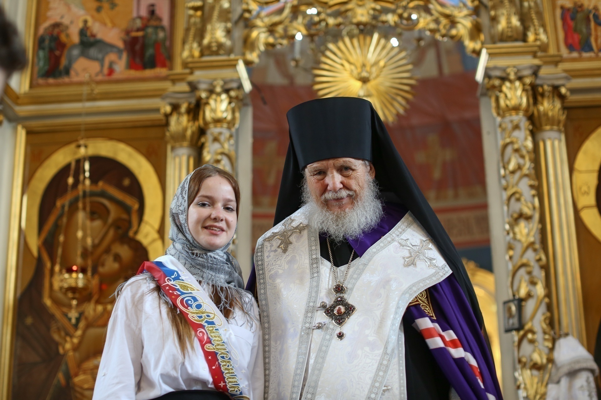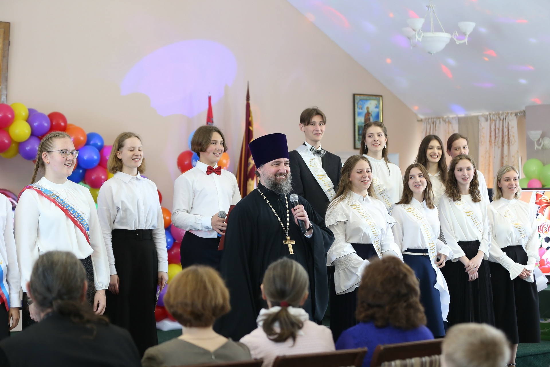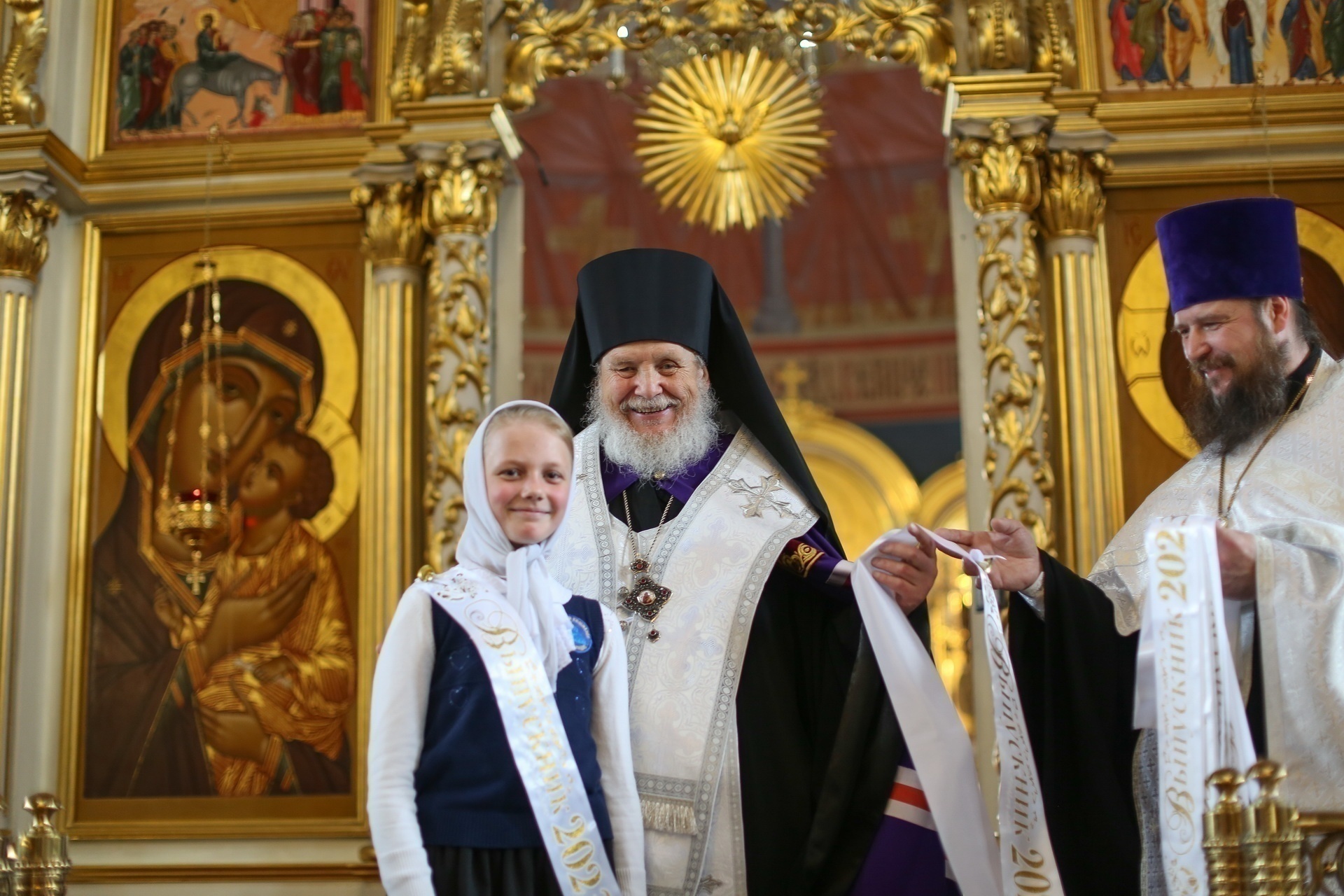 По окончании молебна Его Преосвященство вручил ленты выпускникам, окончившим 4, 9 и 11 классы, кратко побеседовав с каждым из них, после чего обратился к молящимся с архипастырским словом.