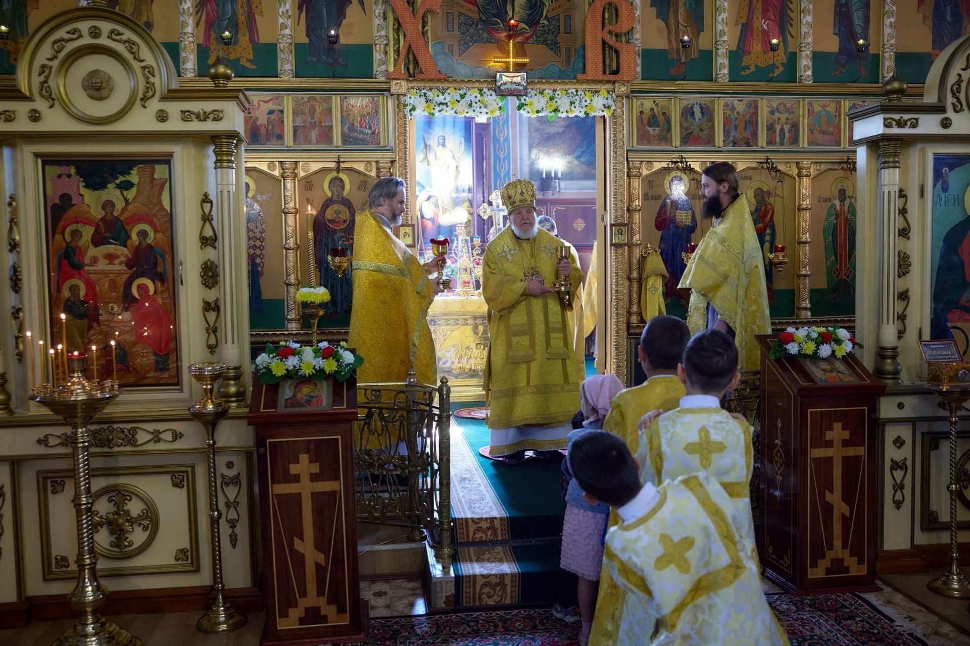 Богослужебные песнопения исполнили молодёжный, народный и детский хоры Иоанна-Богословского храма.