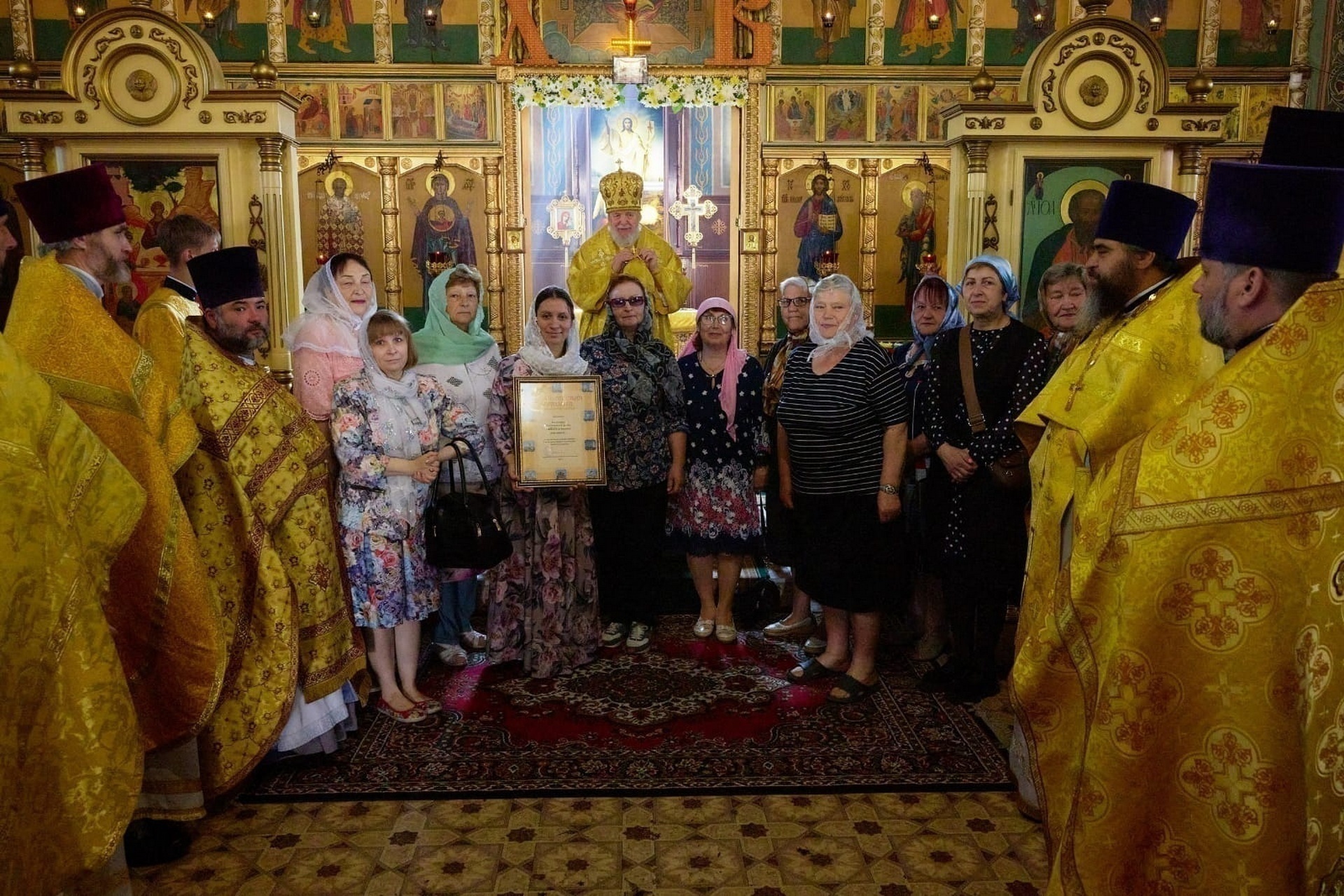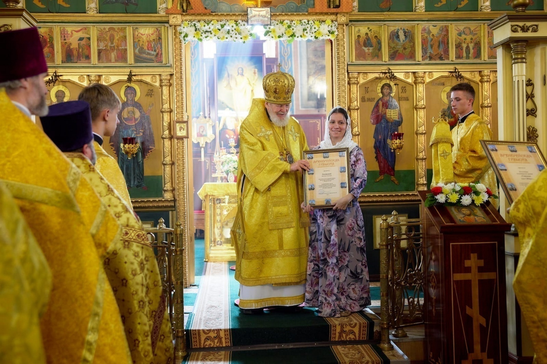 Затем Его Преосвященство вручил Епархиальные грамоты коллективу волонтёрской группы «Готовим для СВОих» и коллективу волонтеров «Шьём для наших» за жертвенную помощь воинам в зоне проведения Специальной военной операции, после чего обратился к сослужившему духовенству и молящимся с архипастырским словом.